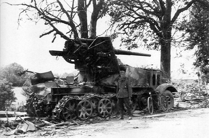 Planifiant une possible campagne contre la Belgique et la France, la Wehrmacht a émis une demande pour un système d’arme mobile et assez puissant pour faire face aux défenses bétonnées. En 1938, le Waffenamt décide de modifier le Flak 18 afin de le rendre opérationnel contre des cibles au sol. Afin de donner à cette arme la mobilité nécessaire, deux solutions sont évaluées. Un canon est installé sur la nouvelle plate-forme SdAnh 201 à deux essieux, modifiés de façon à pouvoir être introduits en service aussi rapidement que possible, tandis que l’autre est installé sur un châssis de SdKfz 8 (12t) comportant une cabine semi blindée. Cette dernière version sera mise au point en quatre mois, d’août à novembre 1938. A la fin de cette année 38, dix véhicules sont prêt et distribués au I.SCHWERE Kompagnie/8.Panzerjäger Abteilung de la 9.Pz Division en préparation de la campagne de Pologne. Cette même unité avec 6 machines de ce type prit part à l’invasion de la Belgique et de la France au sein du XIX Armee Korps de Guderian, en support de la 2. Pz Division. En juin 1941 , la compagnie est déplacée en Russie. Le 29 janvier, elle est renommée Panzerjäger –Kompagnie 601, et le 21avril, I.Kp. Pz jg. Abbt. (Sfl) 551, combattant avec le A.O.K2 jusqu’à ce que les 3 dernières machines soient perdues en mars 1943. Malgré quelques limitations, telles qu’un poids excessif et un débattement réduit, le 88 sur plateforme 12t était malgré tout considéré comme une arme efficace en son temps. De plus cette machine était vraiment appréciée par la troupe. Le semi chenillé utilisé pour cette conversion était le SdKfz 8 12t dans sa variante DB9 . On prenait ce châssis quand il était disponible car construit en nombre plus restreint Ce châssis différait du DB10. Son développement rapide ne permettant pas beaucoup de modifications, seuls les barres de châssis et les suspensions furent renforcées. Le moteur et le compartiment de conduite étaient protégés contre les armes de petits calibres, tandis que le canon a reçu un nouveau panneau de blindage. De la place a été aménagée à l’arrière pour installer des containers à munitions pouvant contenir chacun 3 obus. Le canon a aussi reçu quelques modifications : le système de mise de feu, le système de chargement des obus et le système de réglage des fusées d’obus ont été simplement supprimés : le Flak Zielfernrohr 20 pour le tir direct a été retenu, le débattement latéral réduit à 50 (droite et gauche) et l’élévation à -4° et +15°. En plus des containers à munitions latéraux (pour un total de 12 coups) à l’arrière du véhicule, un autre compartiment pour 6 obus fut installé à la gauche du canon. En desous, une boîte pour un Flak Zielfernrohr fut aussi installée.