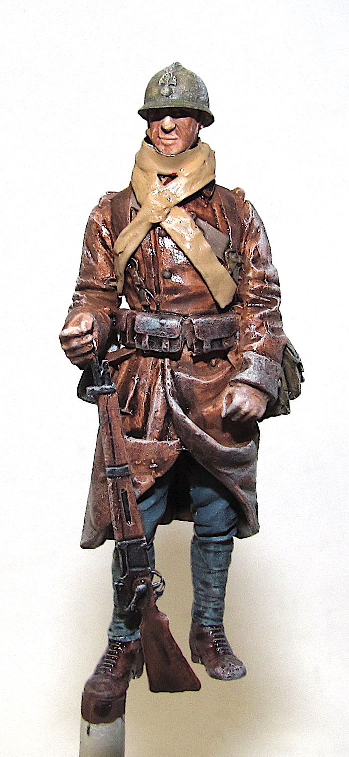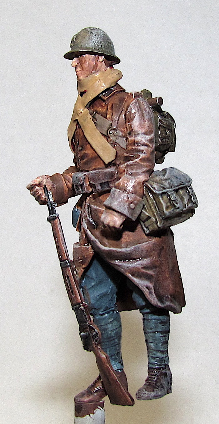 Un réserviste d’une division B, fatigué, en position hivernale, équipé de pièces réutilisées de 14–18 (pantalon , bandes molletières, bidon de 2 litres bleu horizon), engoncé dans sa capote lourde, avec son masque ARS, son bidon BH, ses guêtres et son fusil usé.