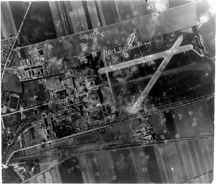 On distingue la piste de décollage et d’atterrissage ainsi que la piste secondaire de cet aérodrome allemand. Le site a été bombardé et on peut voir les cratères creusés par les bombes. Ce terrain appartenait l’usine Focke Wulf produisant principalement le FW190 à partir de 1941. Des avions sont visibles dont certains ont été détruits lors du bombardement. Des batteries de DCA assurent la protection du site.