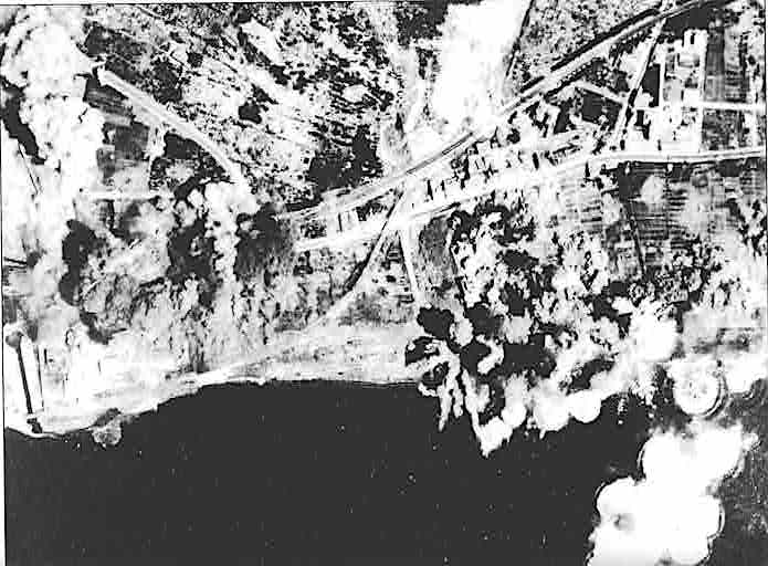 Avant le débarquement du 9 septembre 1943, l’aviation alliée bombarde Salerne. Cette photographie a été prise pendant un raid de B-26 Marauder de l’US Air Force.