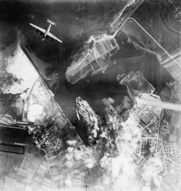 Un Consolidated Liberator B24 du 205th Bomb Group survole le port de Monfalcone lors d’une attaque aérienne de jour. Les installations portuaires, la zone de construction navale et des quais de réparation sont recouverts par la fumée dégagée par l’éclatement des bombes.