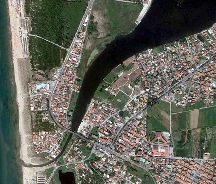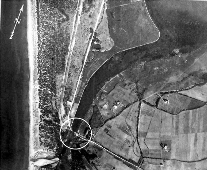 Cette photographie prise par le Squadron 682 de la RAF montre sur la zone sud du lac le barrage routier contrôlant l’accès du pont enjambant le chenal faisant communiquer le lac avec la mer et l’emplacement du point d’appui près de Torre di Patria.