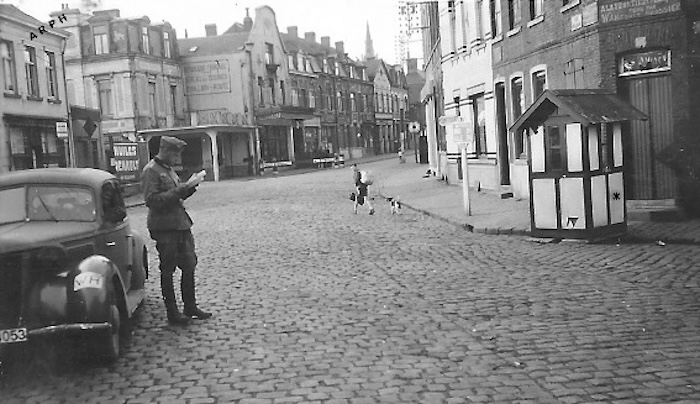 Halluin, rue de Lille, sous l’Occupation. Un écolier, cartable à la main, se rend à l’école, suivi de son chien. Sur le trottoir opposé, un soldat allemand consulte une carte, symbole de la présence militaire dans la vie quotidienne.