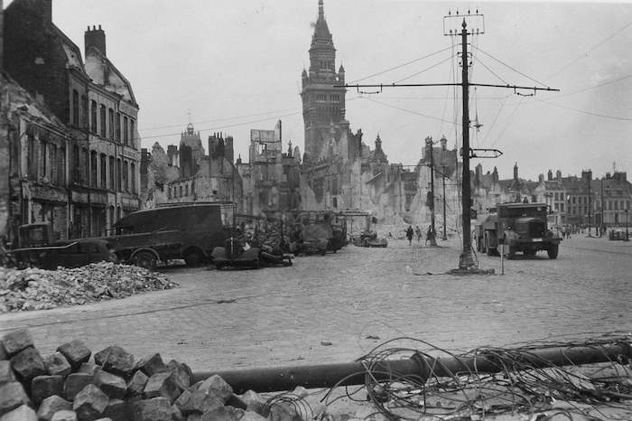 Photographie prise à Dunkerque peu après la bataille de mai–juin 1940, montrant la ville en ruines sous occupation allemande. Au centre se dresse la tour de l’hôtel de ville, entourée de décombres et de bâtiments calcinés. Des camions de la Wehrmacht stationnent sur la place du Minck, utilisés pour le ravitaillement logistique de la future Festung Dünkirchen. Cette scène témoigne de la destruction totale de la ville et de sa transformation en base militaire du Reich.