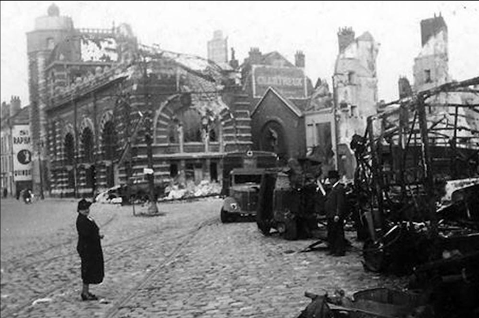 Cette photographie prise en juin 1940 montre la tour du Leughenaer dominant un centre-ville de Dunkerque dévasté. À droite, les Halles centrales apparaissent en ruines, tandis qu’un amas d’épaves de véhicules calcinés, dont une ambulance, témoigne de l’intensité des bombardements. Quelques civils médusés observent la scène, figurant la sidération de la population face aux destructions. Les habitations visibles à gauche semblent encore debout, mais disparaîtront elles aussi durant la guerre. L’image saisit l’ampleur des ravages causés par les combats et les incendies de mai-juin 1940.