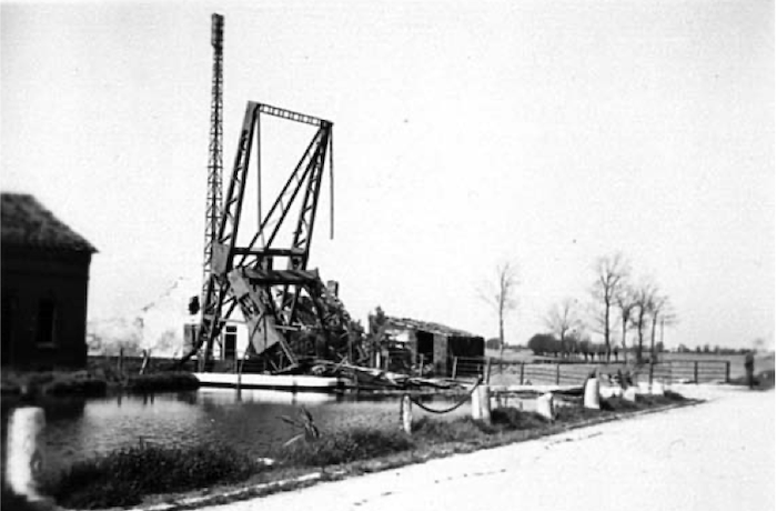 Photographie d’un pont basculant saboté afin d’empêcher les Alliés de franchir la Colme à Hoymille. Cette photographie a probablement été prise fin 1944/début1945.