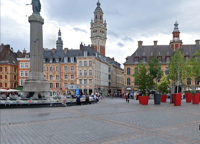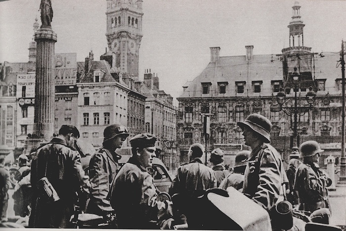 Sur la Grand-place de Lille les troupes motorisées allemandes prennent un temps de repos après la chute de la ville, héroïquement défendue par la général Molinier et la 1re armée française.