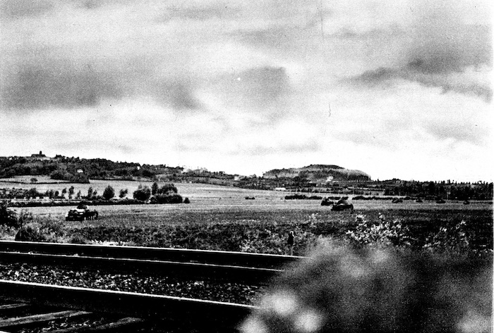 Les trois photographies montrent la progression des fantassins et des chars vers Cassel. Elles ont été prise le long de la voie ferrée qui relie Hazebrouck à Dunkerque à la hauteur de Sainte-Marie-Cappel.