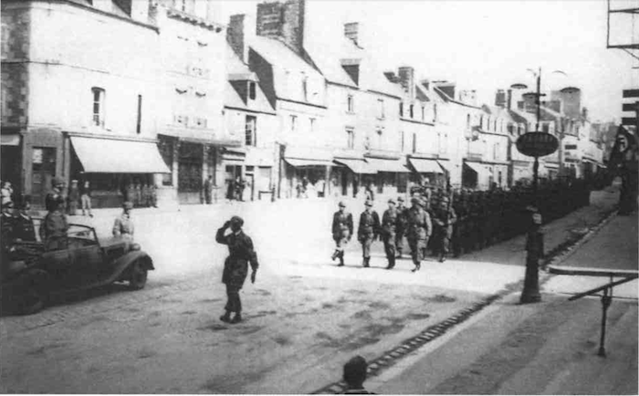 Les forces allemandes d'occupation défilent. Un détachement de troupes de campagne de la Luftwaffe, issu d'une division de campagne (autorisée par Hitler en 1942 à intégrer les effectifs excédentaires de l'armée de l'air), défile à Villedieu-les-Poêles.