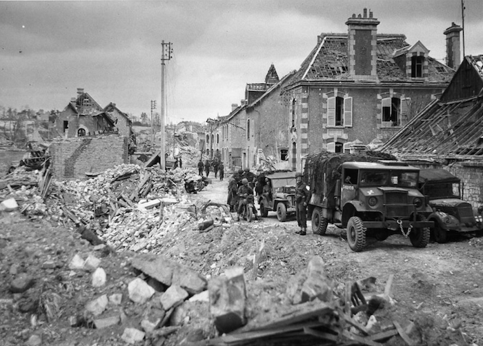Les troupes britanniques investissent complètement Caen le 20 juillet 1944. Un détachement britannique progresse lentement dans les rues rendues méconnaissables par les ruines causées par les bombardements à répétition subie par la citée de Guillaume le Conquérant. Au premier plan, on distingue un Chevrolet 15cwt 4x2 Ssuivi par une jeep. Le véhicule masqué partiellement par le Chevrolet pourrait être un Fordson WOT .