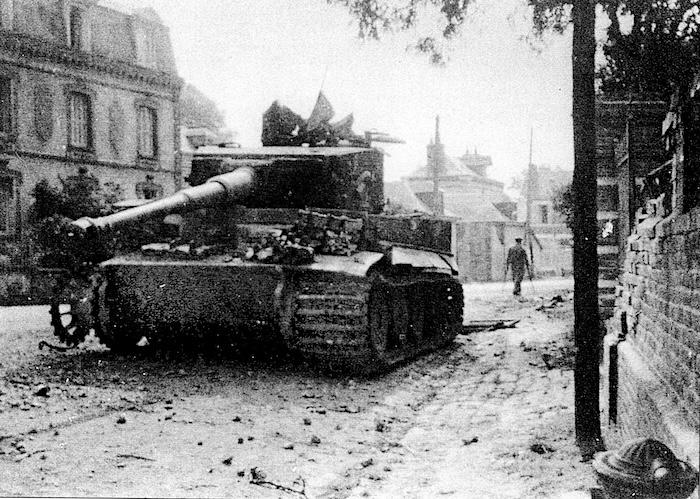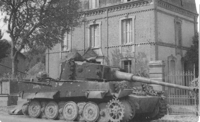 Le 24 août 1944, à l’intersection de la rue Guy Pépin et Alphonse Assegond, ce Tiger I appartenant au Schwer Panzer-Abteilung 503 aurait été détruit lors d’une attaque aérienne occasionnant d’importants dégâts à l'arrière du char. Cependant l’étude de la photographie laisserait à penser à une autre hypothèse, le char aurait été abandonné par son équipage suite à une rupture de chenille. Suite à cet abandon, le blindé a peut-être été la cible d’un avion.