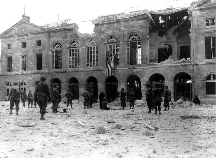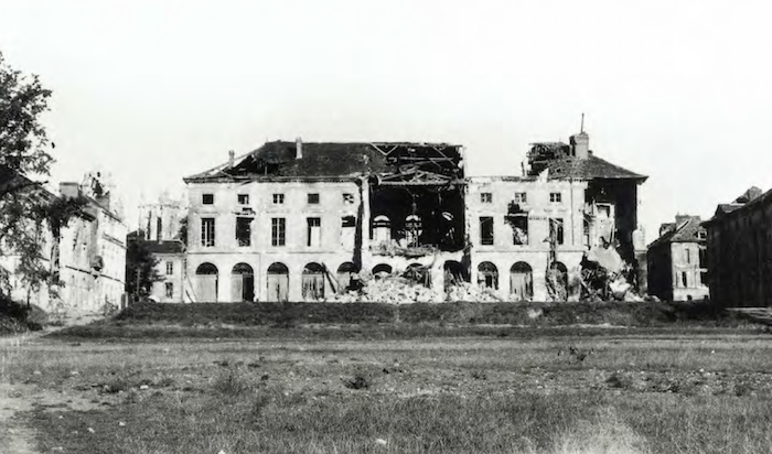 Les bombardements américains qui ont frappé la ville le 7 juin 1944 ont occasionné d’importants dégâts à l’hôtel de ville.