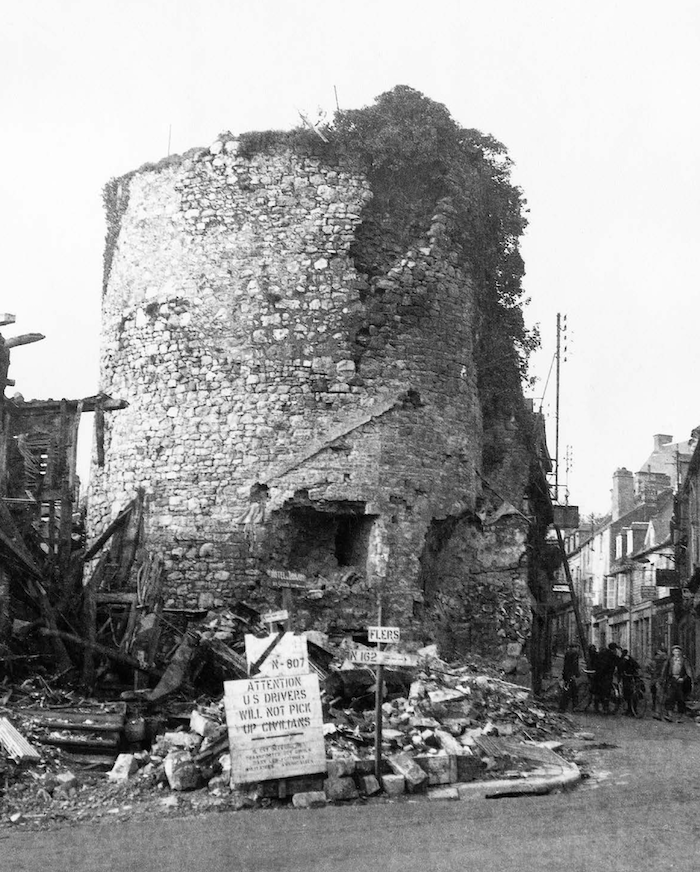 Les immeubles bordant la place de la Porte d’Alençon ainsi que la tour portent les stigmates dus aux bombardements américains des 14 et 23 juin 1944. De nombreuses habitations totalement ruinées ne furent pas reconstruites donnant à cet important nœud routier sa physionomie actuelle.