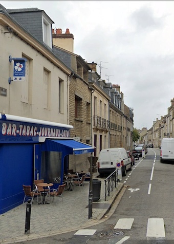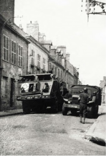 12 août 1944, rue de Lancrel , un Dodge WC 51 dépasse un porte-char M26 Pacific (Armoured Tank recovery Vehicle) tractant une remorque M15.