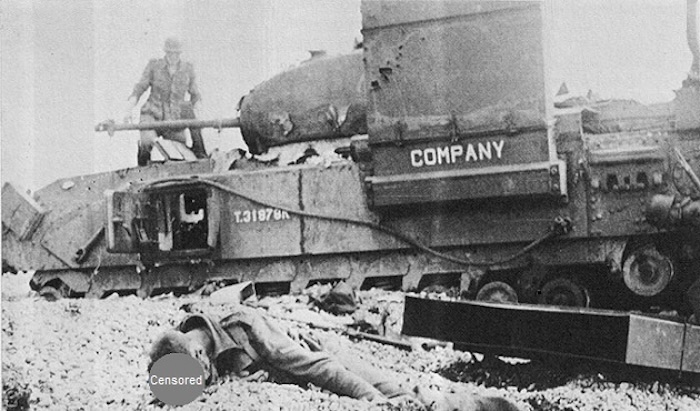 Une autre vue montre COMPANY après sa capture, tandis que des soldats allemands examinent le char abandonné. Au premier plan, gisant sur le sable, se trouve une rehausse latérale du système d’admission d’air, provenant d’un autre char équipé du même dispositif. Développé à l’origine pour le raid de Dieppe en 1942, le système "Deep Wading" du Churchill sera également employé lors du débarquement de Normandie. Les chars étaient rendus étanches par un ensemble de joints et de protections, tandis que des conduits surélevés, montés sur les admissions d’air et la sortie d’échappement, permettaient une mise à terre en eau peu profonde. Ce dispositif autorisait la mise à terre des chars sans que les péniches de débarquement soient contraintes d’accoster directement sur le rivage, réduisant ainsi leur exposition au feu ennemi.
