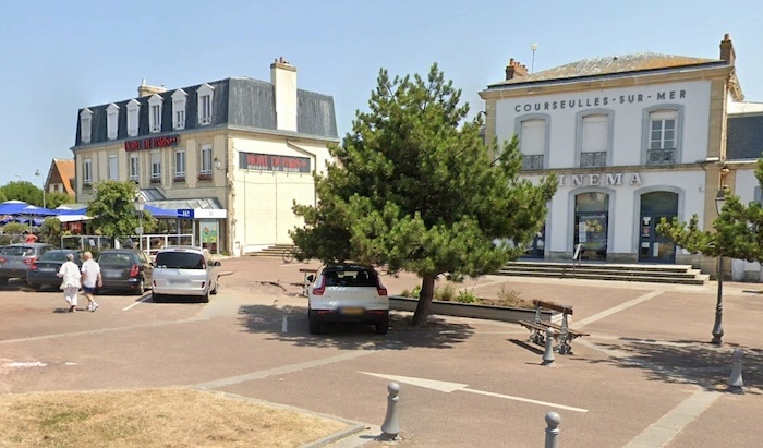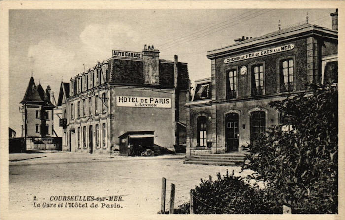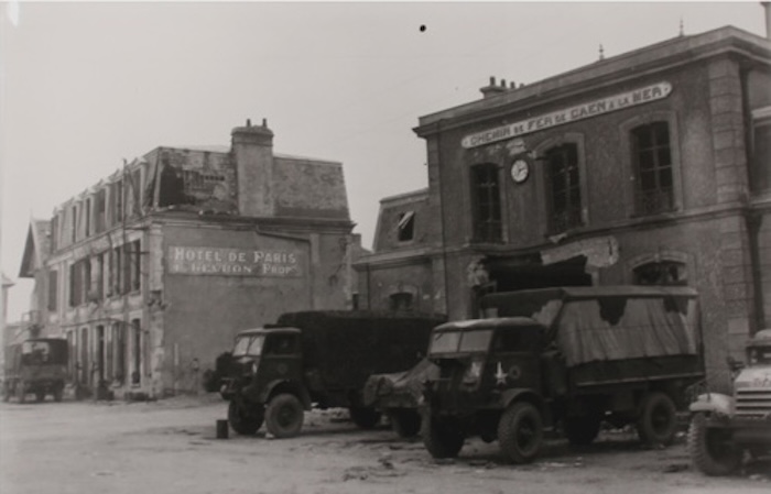 L’image montre l’ancienne gare de Courseulles-sur-Mer, reconvertie ultérieurement en cinéma. Peu après le débarquement, l’espace attenant à la gare est utilisé comme zone de stationnement militaire, illustrant la rapide prise en main des infrastructures civiles par les forces alliées.