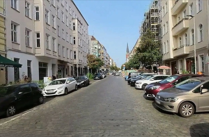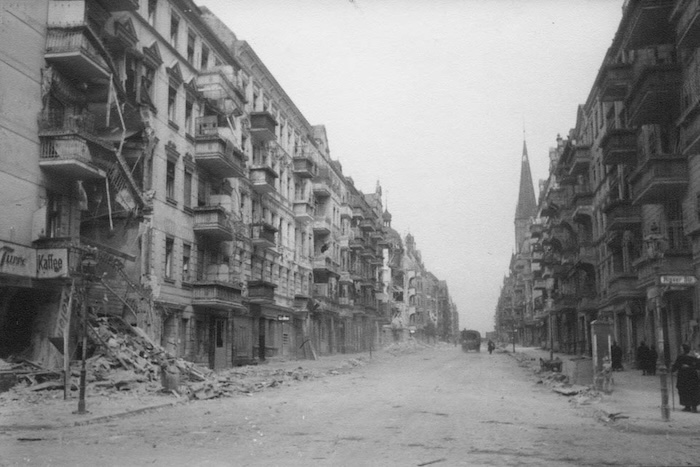 Mai 1945, la bataille de Berlin est terminée. Le calme est revenu. La Samariter/Ringear Strasse est vide, seul un véhicule circule dans la rue.