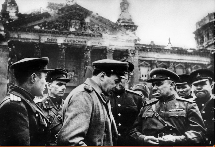 Un groupe d'officiers russes discute devant l'entrée du Reichstag.