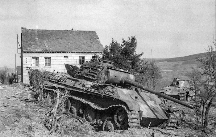 2 photographies d’un Panther Ausf.G détruit dans une rue de la Gleize.