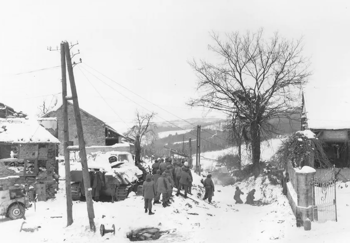L’infanterie américaine prend possession du village dont les décombres de certaines maisons fument encore suite à l’utilisation d’obus au phosphore par l’artillerie américaine le 23 décembre.