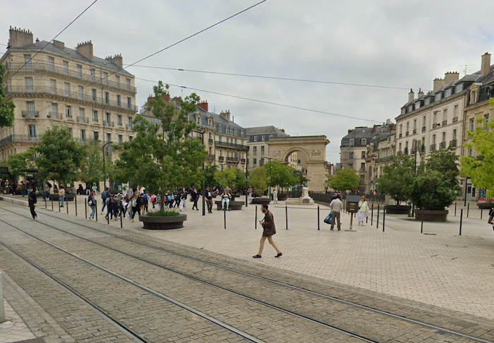 Scène d’occupation allemande : un semi-chenillé Sd. Kfz 251/1 Ausf.A traverse la place Darcy devant un groupe de civils.