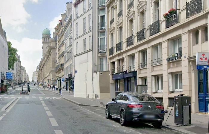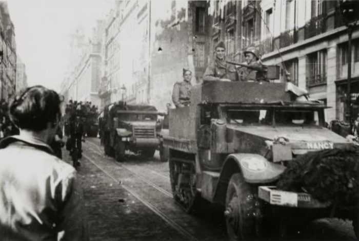 Sur cette photographie prise le 25 août 1944, jour de la Libération de Paris, on voit un half-track M3 baptisé « NANCY », appartenant à la 2e Division Blindée du général Leclerc, progressant dans la rue Saint-Jacques, devant le n° 34. Ce véhicule de transport de troupes, semi-chenillé, est typique de l’équipement américain dont disposait la 2e DB.À bord, plusieurs soldats français arborent le casque américain M1 et l’un d’eux est visible derrière la mitrailleuse Browning .50 cal, en position de tir. Derrière le half-track « NANCY », un deuxième semi-chenillé avance dans l’axe de la rue, suivi d’un automoteur d’artillerie M7 Priest, reconnaissable à son profil massif et à son canon de 105 mm.