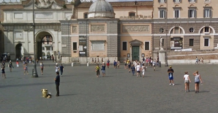 La colonne arrive sur la Piazza del Popollo en passant sous la Porta del Popollo.