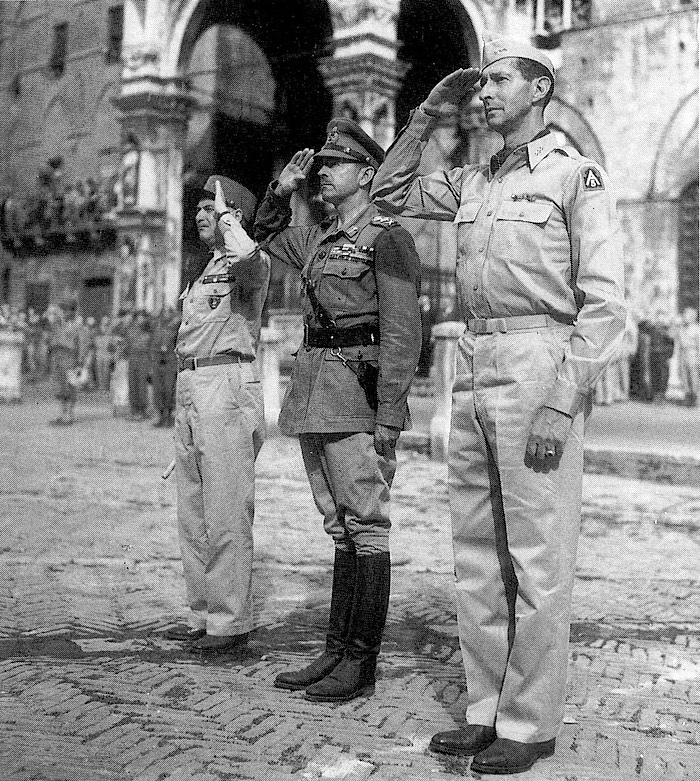 A l'occasion de la fête nationale du 14 juillet 1944, le general Alexander, commandant les forces alliées en Italie (XVth Army Group) et le general Clark commandant la Vth US Army, en présence du général Juin, commandant le Corps Expéditionnaire Français en Italie, ont rendu un hommage unanime aux troupes françaises rassemblées sur la Piazza del Campo de Sienne, en Toscane.