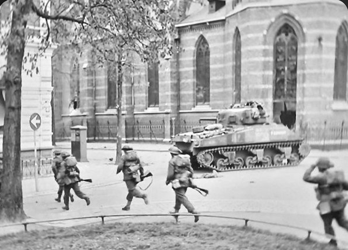 Sous la protection d’un Sherman, des fantassins canadiens progressent au coin de la cathédrale.