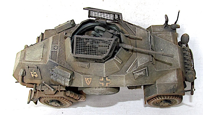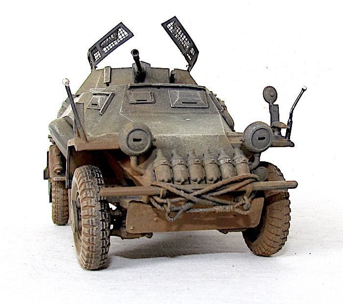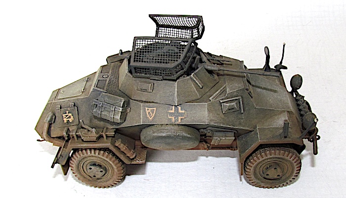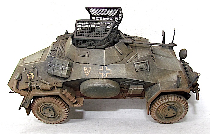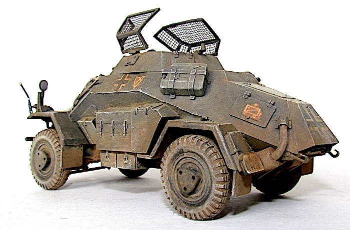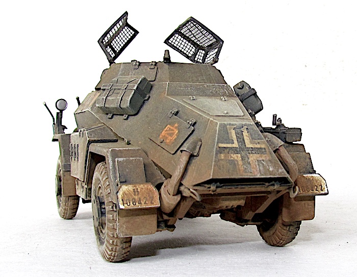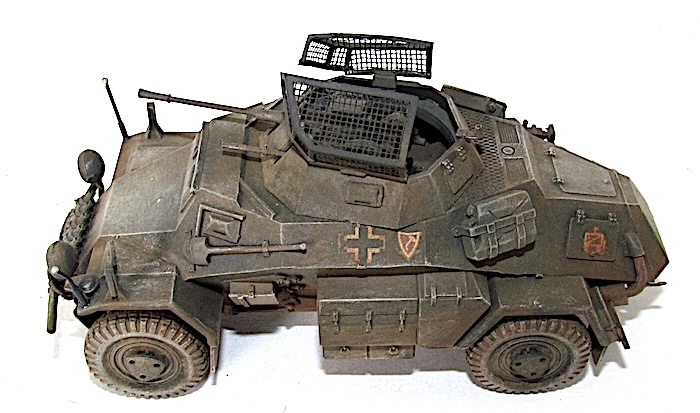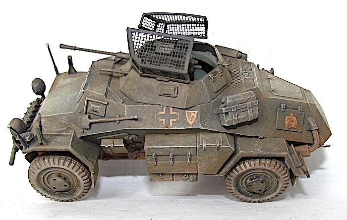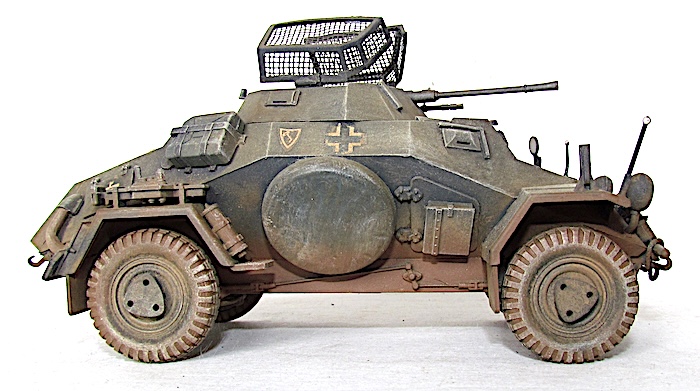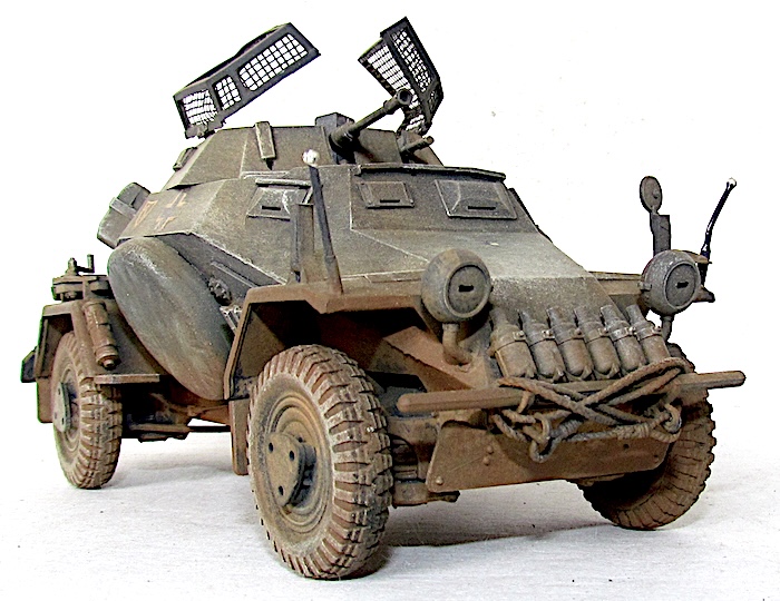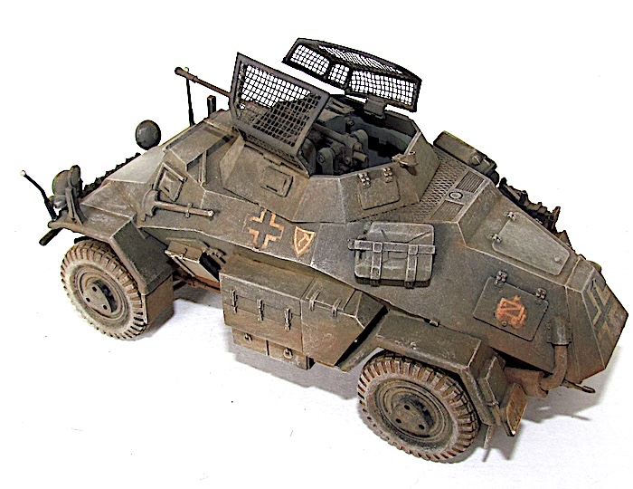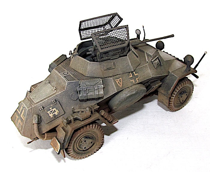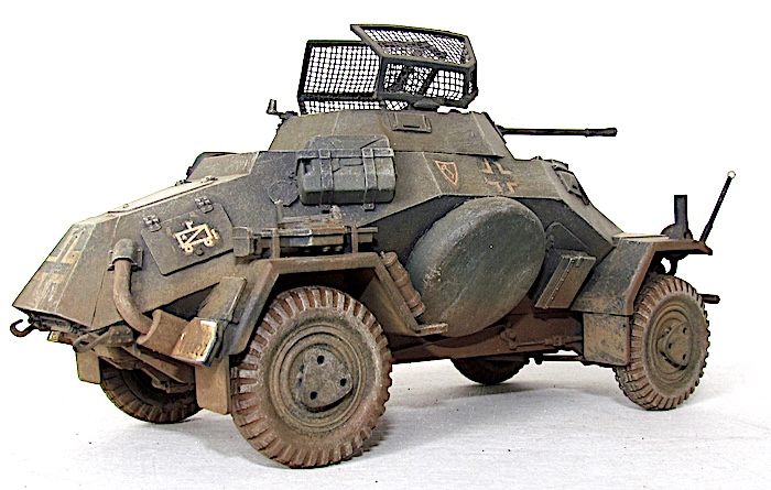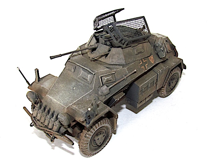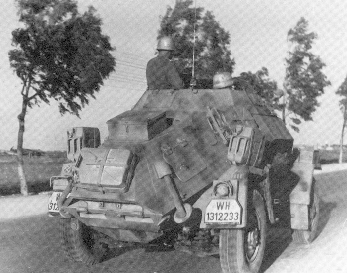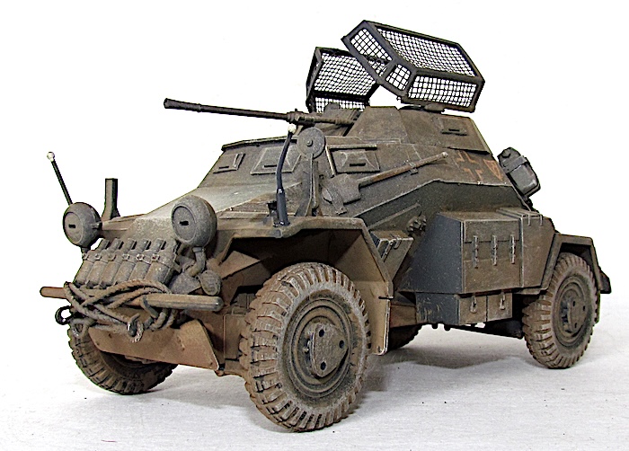 L’année suivante vit l’apparition du Sd.Kfz.222, version profondément modifiée et mieux armée. Désormais doté d’un équipage de trois hommes, il recevait un canon automatique de 2cm KwK 30 en tourelle ainsi qu’une radio de courte portée, ce qui en faisait un des blindés de reconnaissance les plus modernes de son temps. Son habitacle étroit fut partiellement compensé par des compartiments latéraux extérieurs destinés à l’équipement de l’équipage. L’armement plus puissant nécessita une tourelle agrandie, permettant d’accueillir le chef de bord et l’opérateur radio, installé à l’avant de la caisse. Afin de protéger l’équipage contre les grenades, le toit de la tourelle fut recouvert de grilles métalliques pliantes.