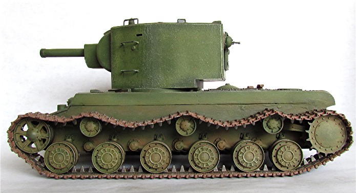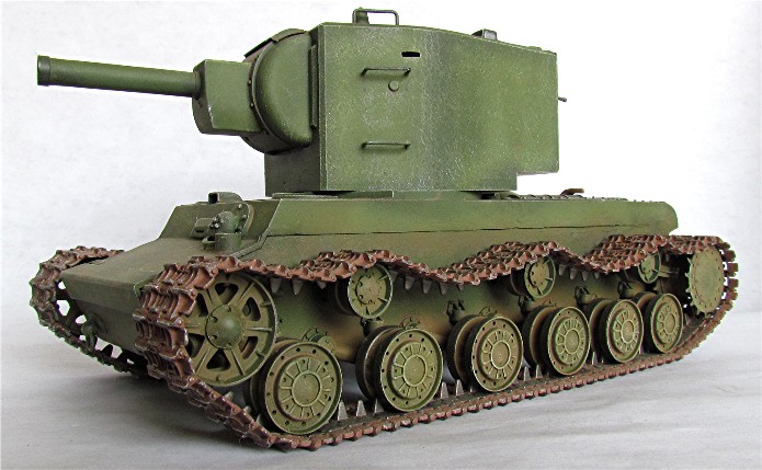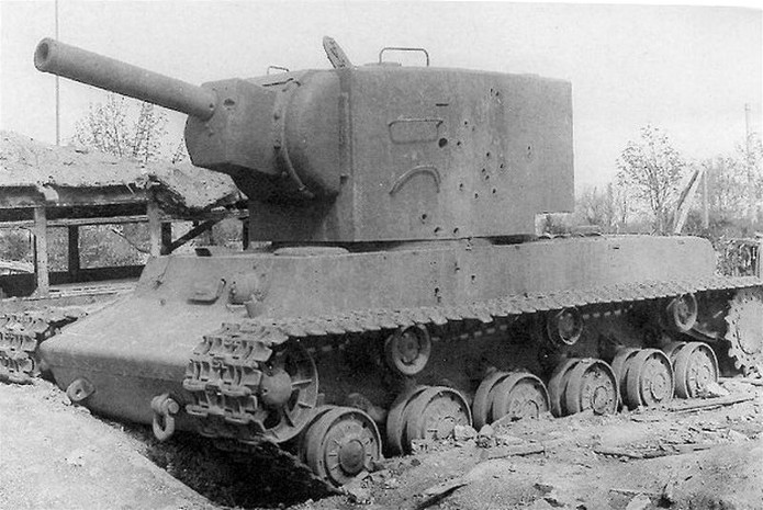En 1941, lors de la préparation de " Barbarossa ", la Panzerwaffe alignait 3500 chars contre 14 à 15 000 chars soviétiques. La valeur des chars soviétiques est inégale car beaucoup de blindés sont obsolètes ou en panne. Cependant, les Allemands vont découvrir dans les jours qui suivent le déclenchement de l’offensive, la présence de chars modernes comme le T-34 et les chars KV. Ces blindés appartiennent à une nouvelle génération de chars qui a totalement échappé aux services de renseignements. Ces chars de " rupture " sont dotés d’un blindage qui résiste aux antichars allemands. Seul le canon de 88 mm parvient à percer son blindage. Le chars KV et T34 ont commencé à être livrés aux unités frontalières en avril 1941. C’est environ 500 chars de la série KV qui seront ainsi en dotation à l’ouverture des hostilités. Le KV-II est une déclinaison équipée d’un obusier de 152 mm qui fait de lui une casemate ambulante dont le rôle relève plus du soutien d’infanterie que du char de combat. Construit dans les usines de Leningrad, sa production sera arrêtée en 1941. C’est dans le secteur du groupe d’armée " Nord " à proximité des usines de fabrication que les Allemands devront livrer combat contre ce monstre. Tombé en nombre important entre les mains des soldats allemands, il est tout d’abord présenté dans les défilés puis ensuite intégré dans les unités de la Wehrmacht ou il prend la dénomination de (Sturm)Panzerkampfwagen KV-II 754 (r). Conservant ses caractéristiques propres, la modification la plus visible sera l’adjonction en tourelle d’une coupole d’observation de PZ III à l’usage du chef de char. Sur certains modèles, un panier sera installé à l’arrière de la caisse en vue d’un emport complémentaire en munitions. Il sera utilisé dans des missions d’instruction, de maintien de l’ordre et de combat en soutien d’infanterie.