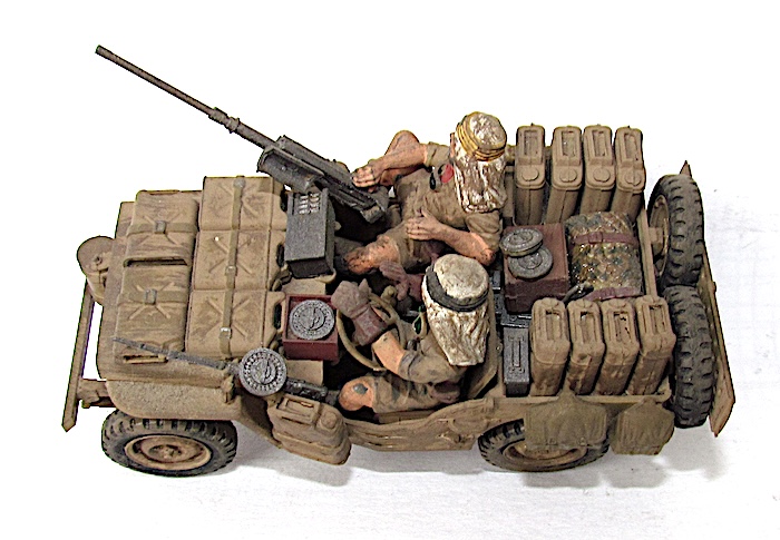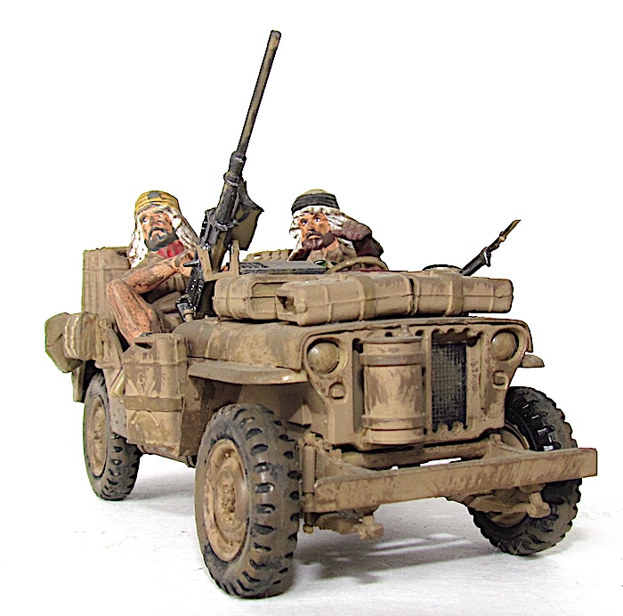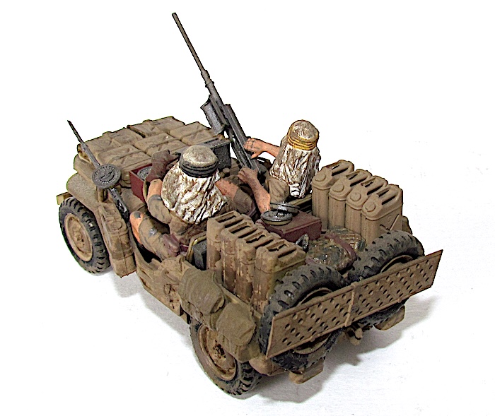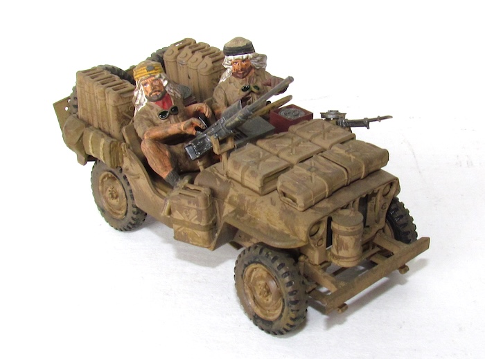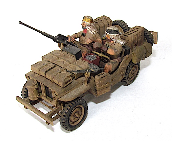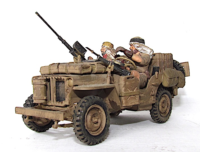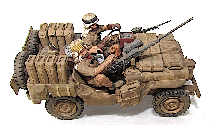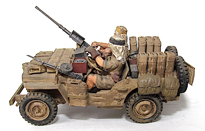 La Willys MB Jeep utilisée par le Special Air Service en Afrique du Nord (1942–1943) illustre parfaitement l’adaptation d’un matériel standard à une guerre atypique. Conçue à l’origine comme véhicule léger de reconnaissance, robuste et mobile, elle devient entre les mains du SAS une plateforme de combat polyvalente, taillée pour les immensités désertiques.Allégée au maximum — pare-brise et éléments superflus supprimés — la Jeep gagne en mobilité et en fiabilité sur des terrains difficiles. Sa transformation la plus décisive concerne l’autonomie : saturée de jerricans d’essence et d’eau, elle peut parcourir plus de 1 000 kilomètres, rendant possibles des raids très en profondeur, loin de toute base logistique. À cela s’ajoutent des adaptations spécifiques au désert : filtres à air renforcés, équipements de navigation rudimentaires mais efficaces, et matériel de désensablement.