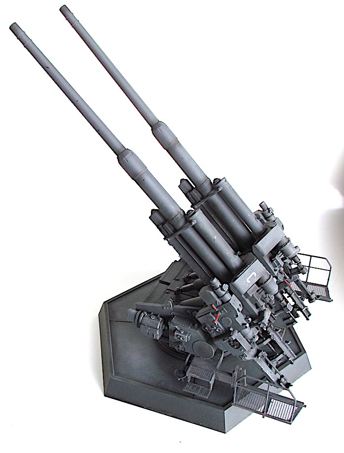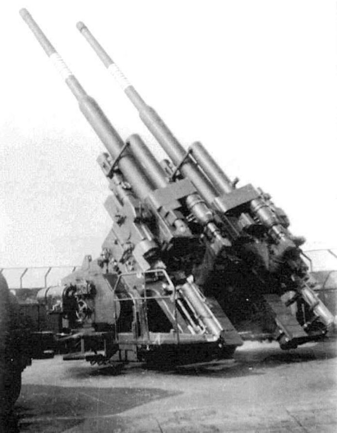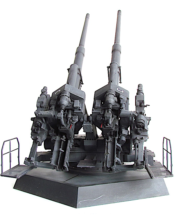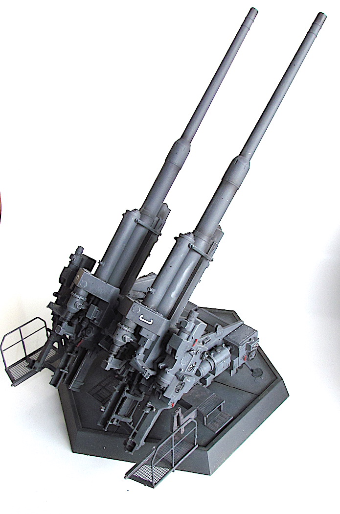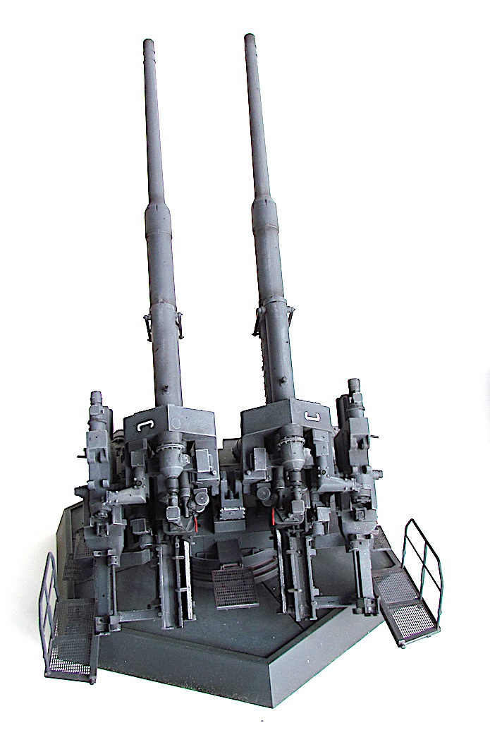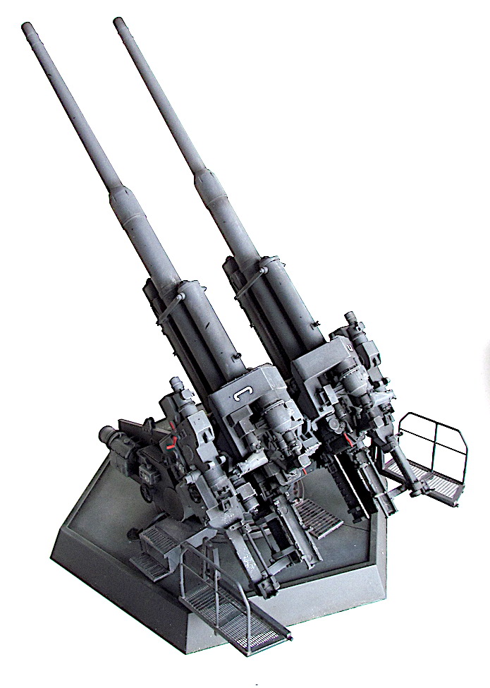 En 1940, la décision est prise d’ériger des tours de DCA (Flaktürme), afin d’améliorer la protection antiaérienne des grandes zones urbaines. La hauteur de ces tours varie, selon le modèle, entre 43 à51 m et elles sont, souvent, construite, quand la topographie locale le permet, sur des emplacements surélevés. Elles permettent de dégager au maximum les secteurs de tir de la Flak, en positionnant les pièces, installées sur les niveaux les plus élevés, au-dessus des immeubles les plus hauts de l’agglomération. Seules Berlin, Hambourg et Vienne seront dotées de ce type d’ouvrage. Il avait été prévu de les armer avec des 15 cm Flak, mais faute de pouvoir disposer du matériel, la seule solution envisageable se résume, dès lors, à les remplacer par des 12,8cm Flak. Pour augmenter le volume de feu et exploiter , au mieux, la surface disponible, Rheinmetall, associé à Hanomag développe une version jumelé, désigné Gerät 44, puis 12,8cm Flakzwilling 40, dont le premier exemplaire est livré en 1942. Ses caractéristiques sont strictement identiques à celles du modèle monotube, sauf sa cadence de tir, 24 coups/minutes, ses dimensions hors tout (L x l x h, 9 120 mm x 5 045 mm x 2950 mm) et son poids sur socle 27 000 kg.