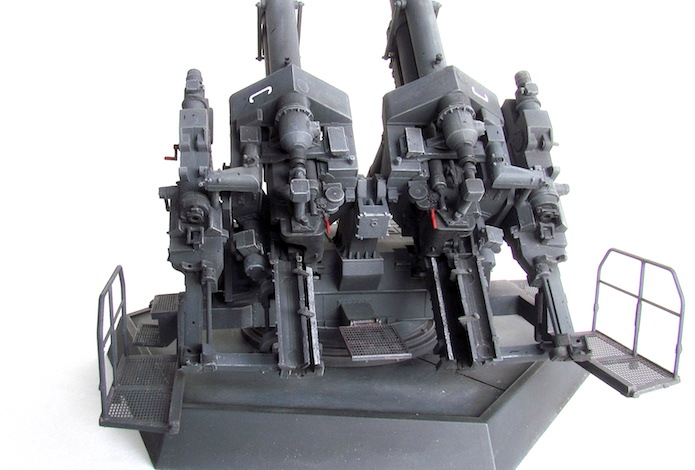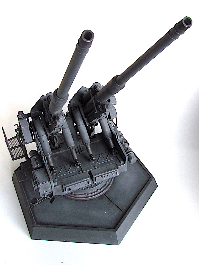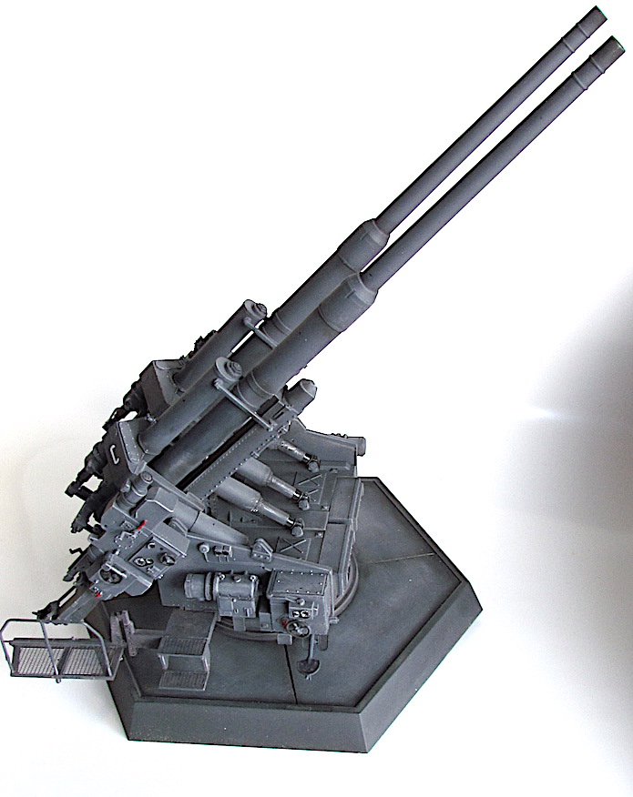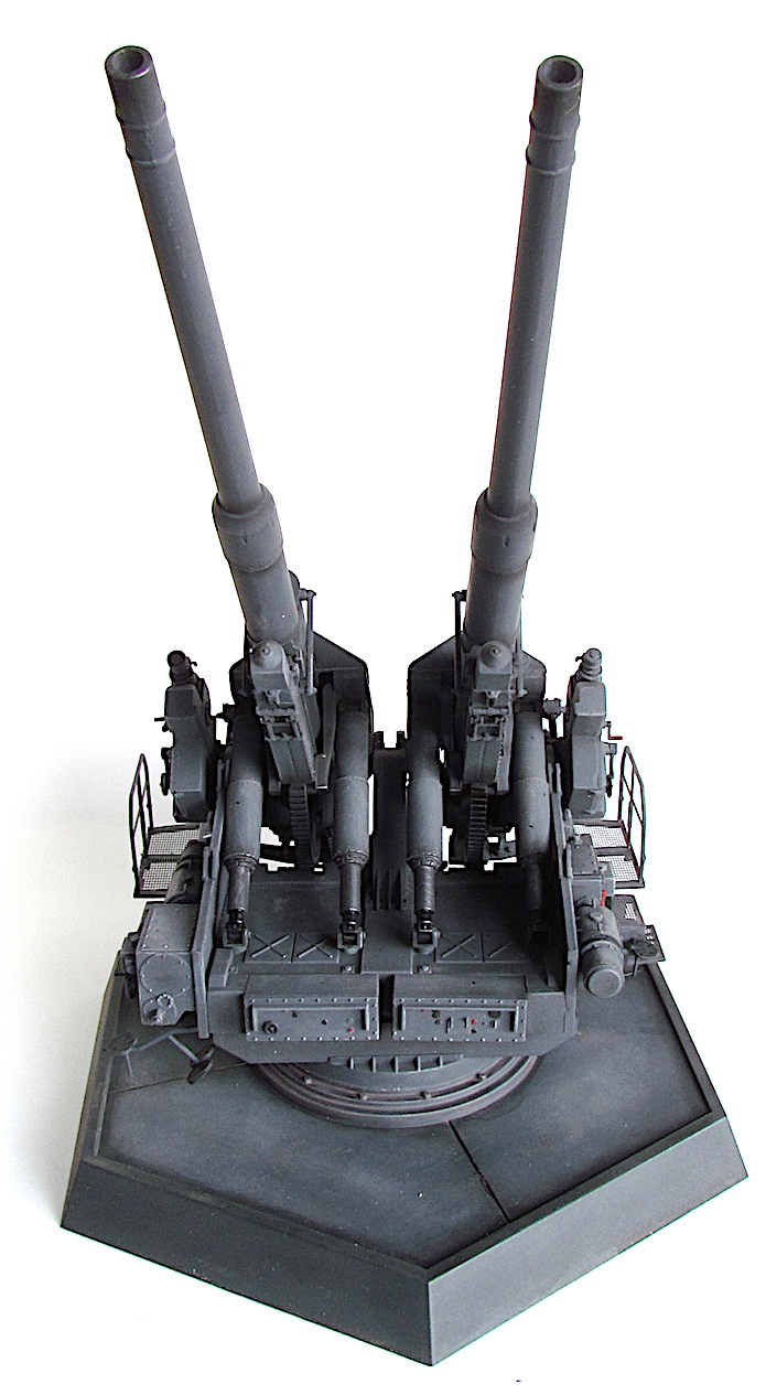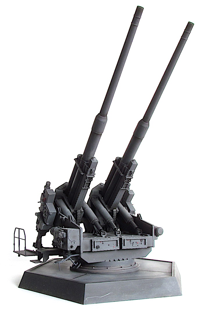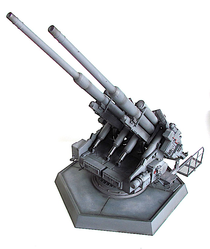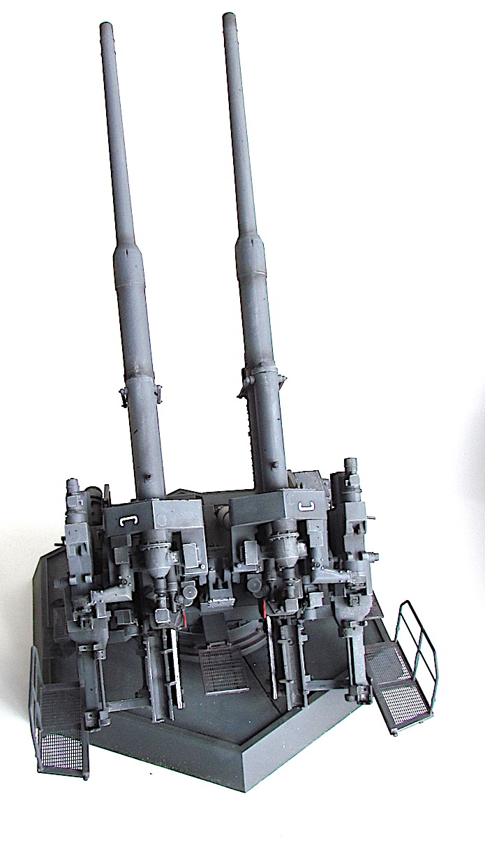 En 1940, la décision est prise d’ériger des tours de DCA (Flaktürme), afin d’améliorer la protection antiaérienne des grandes zones urbaines. La hauteur de ces tours varie, selon le modèle, entre 43 à51 m et elles sont, souvent, construite, quand la topographie locale le permet, sur des emplacements surélevés. Elles permettent de dégager au maximum les secteurs de tir de la Flak, en positionnant les pièces, installées sur les niveaux les plus élevés, au-dessus des immeubles les plus hauts de l’agglomération. Seules Berlin, Hambourg et Vienne seront dotées de ce type d’ouvrage. Il avait été prévu de les armer avec des 15 cm Flak, mais faute de pouvoir disposer du matériel, la seule solution envisageable se résume, dès lors, à les remplacer par des 12,8cm Flak. Pour augmenter le volume de feu et exploiter , au mieux, la surface disponible, Rheinmetall, associé à Hanomag développe une version jumelé, désigné Gerät 44, puis 12,8cm Flakzwilling 40, dont le premier exemplaire est livré en 1942. Ses caractéristiques sont strictement identiques à celles du modèle monotube, sauf sa cadence de tir, 24 coups/minutes, ses dimensions hors tout (L x l x h, 9 120 mm x 5 045 mm x 2950 mm) et son poids sur socle 27 000 kg.