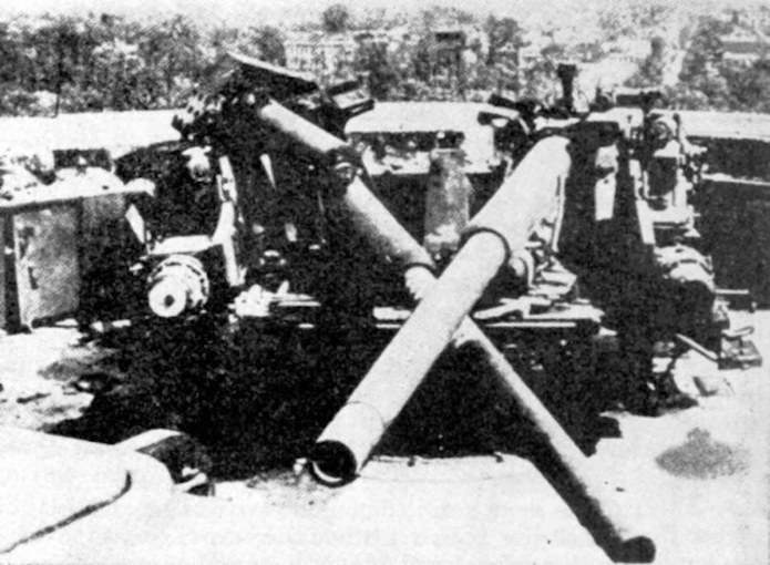 Nota : de nombreux essais en quantités limitées, de munitions sous-calibrées à sabot de 10,5cm et de projectiles avec fusée d’appoint ; objectif : recherche d’accroissement de la Vo (jusqu’à 1 530 m/s) pour améliorer le plafond d’altitude