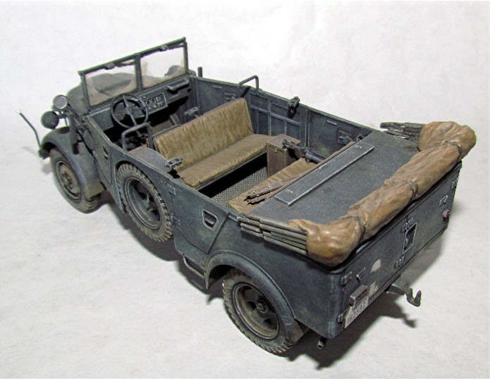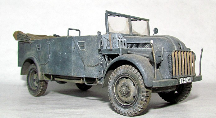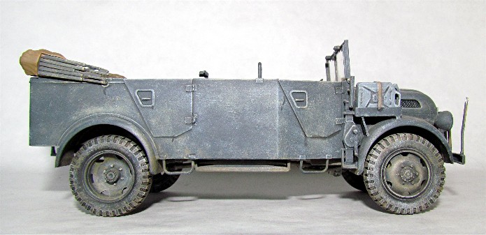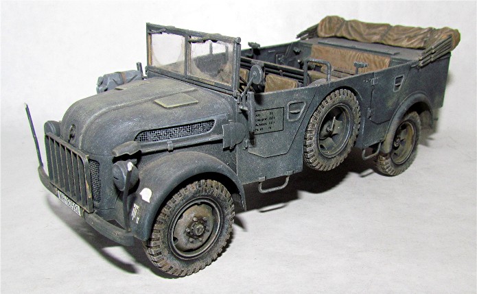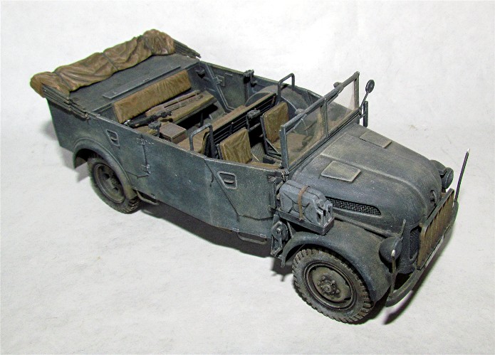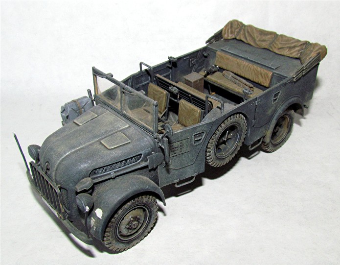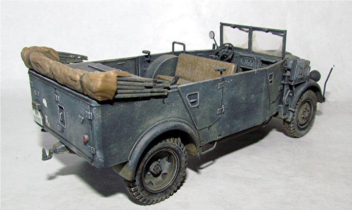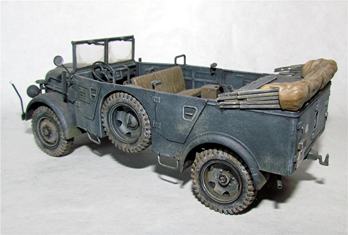 Au début de la 2eme Guerre mondiale, l’Allemagne remporta de nombreuses victoires en utilisant la stratégie de la « Blitzkrieg ». Cela renforça encore l’importance que la Wehrmacht accordait aux unités mécanisées et à la nécessité de disposer de véhicules de transport fiables. Au printemps 1940, le ‘Schell programme’ supervisé par le général Schell fut lancé pour standardiser et accroître la production des véhicules à roues de l’armée allemande. Par exemple, le nombre de types de camions et de voitures fut réduit des deux tiers et ils furent classifiés en classe de tonnage 1,1.5, 3, 4.5, et 6.5. Un des véhicules de la classe 1.5 était le Steyr 1500A/01à transmission intégrale fabriqué en Autriche. Basé sur le châssis du camion 1500A, il avait un capot arrondi et une barre de protection caractéristiques, une suspension à barre de torsion à l’avant et ressort à lames à l’arrière. Il pouvait transporter jusqu’à 8 passagers. La puissance du moteur 8 cylindres de 85 cv refroidi par air était transmise par une boîte de vitesse à quatre rapport. La vitesse maximale sur route était de 100km/h. Selon la date de production, la position de la roue de secours variait. Vers la fin de la guerre, certains véhicules reçurent des vitres blindées et des plaques d’acier renforcées dans les portières. 12.450 exemplaires furent produits entre 1941 et 1944, utilisé comme voiture d’état-major, transport de personnels, tracteurs d’artillerie légère et ambulance. On les rencontrait sur tous les fronts, en Europe de l’Ouest, des Balkans à la Russie et en Afrique du Nord. Dans la guerre du désert, ils étaient très appréciés pour leur mobilité et fiabilité.