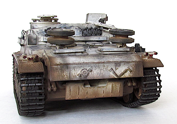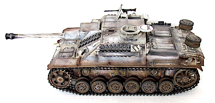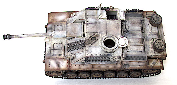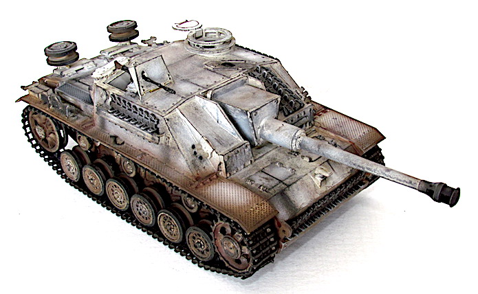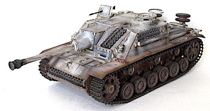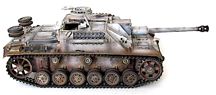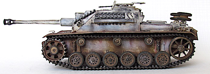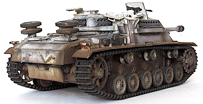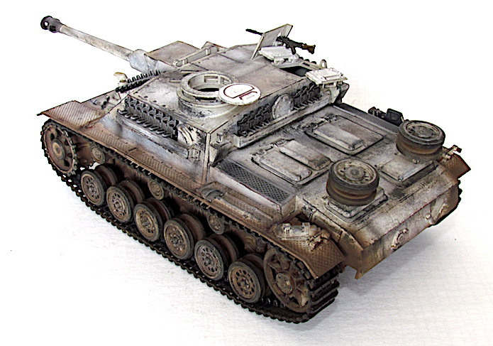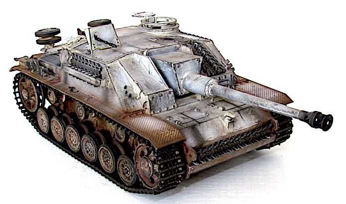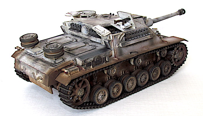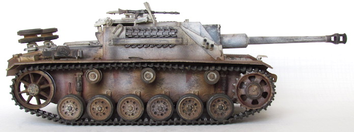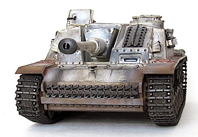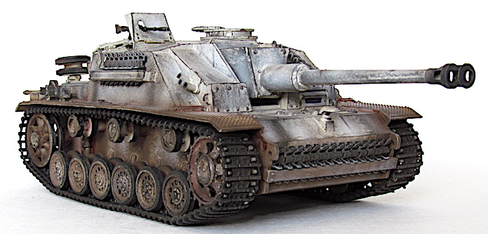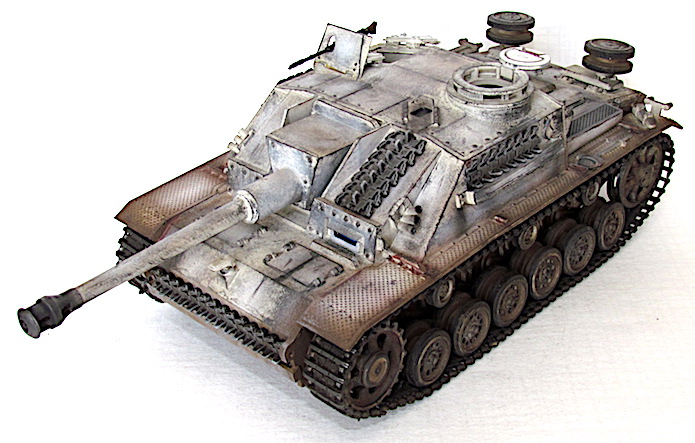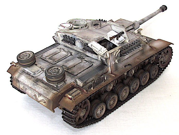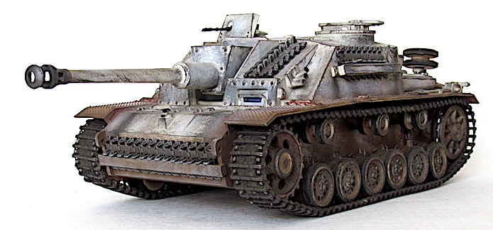 Assemblé dès décembre 1942 et construits sur des châssis de Panzer III Ausf. L et M , les premiers StuGe III Ausf. G sont munis d’une coupole à 7 épiscopes mobiles, pour le chef d’engin. En outre, des flancs plus verticaux et élargis permettent un gain de place afin d’embarquer plus de munitions. Par ailleurs, le matériel radio est transféré à l’intérieur et les coffres extérieurs sont supprimés. En mars 1943, le double épiscope du pilote (Fahrerfernohr) disparaît. Toujours en 1943, à l’été, le ventilateur est déplacé à l’arrière de la casemate. Par ailleurs, les 7 épiscopes deviennent fixes. Enfin, la pâte antimagnétique Zimmmerit est de type gaufré sur les engins sortant des usines Altmärkische Kettenwerk GmbH (Alkett) et de type damiers pour ceux fabriqués par Mühlenbau und industrie AG (MIAG).