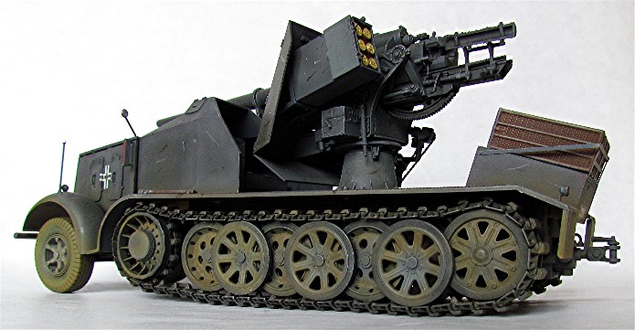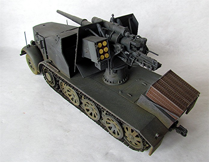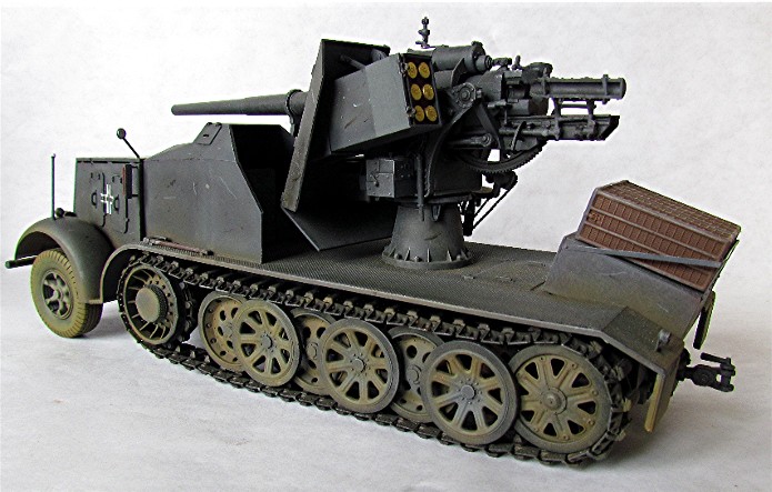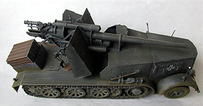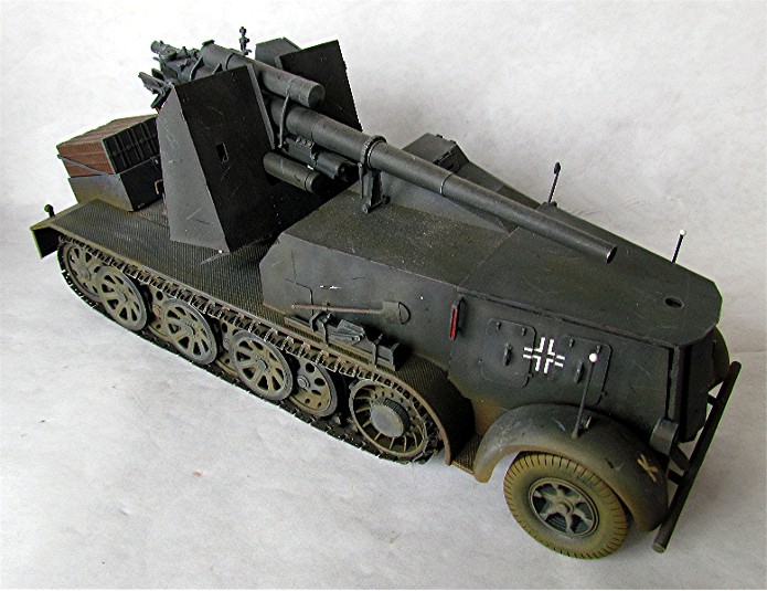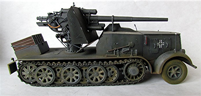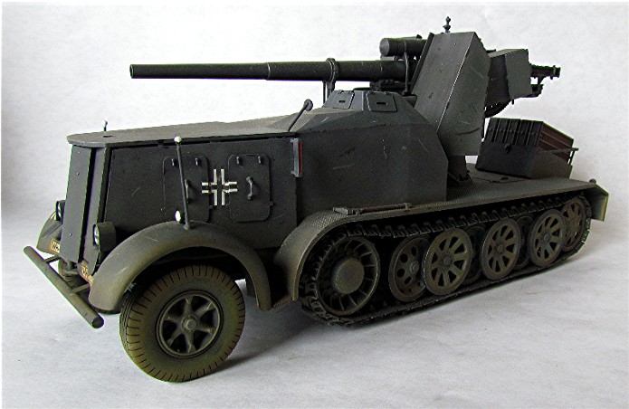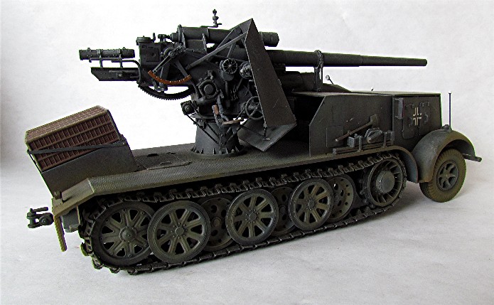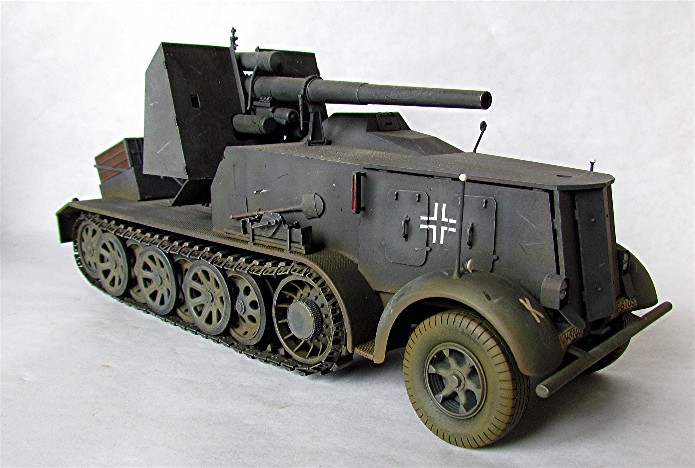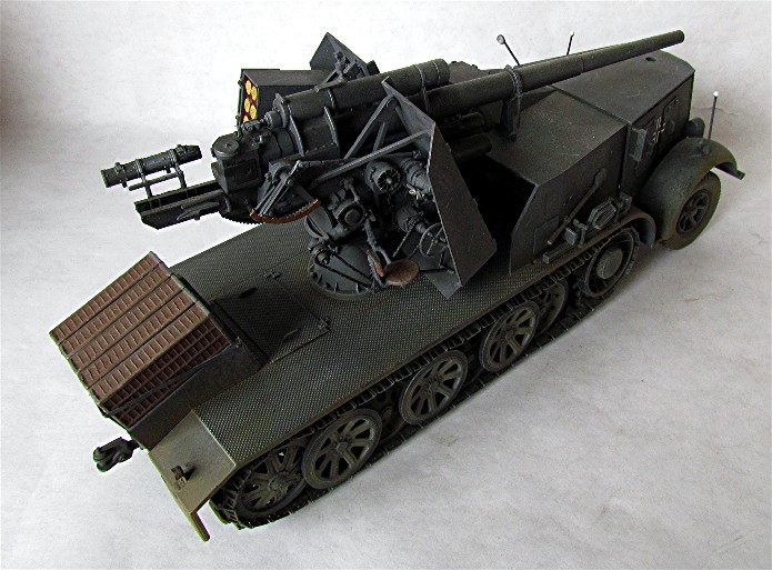 Planifiant une possible campagne contre la Belgique et la France, la Wehrmacht a émis une demande pour un système d’arme mobile et assez puissant pour faire face aux défenses bétonnées. En 1938, le Waffenamt décide de modifier le Flak 18 afin de le rendre opérationnel contre des cibles au sol. Afin de donner à cette arme la mobilité nécessaire, deux solutions sont évaluées. Un canon est installé sur la nouvelle plate-forme SdAnh 201 à deux essieux, modifiés de façon à pouvoir être introduits en service aussi rapidement que possible, tandis que l’autre est installé sur un châssis de SdKfz 8 (12t) comportant une cabine semi blindée. Cette dernière version sera mise au point en quatre mois, d’août à novembre 1938. A la fin de cette année 38, dix véhicules sont prêt et distribués au I.SCHWERE Kompagnie/8.Panzerjäger Abteilung de la 9.Pz Division en préparation de la campagne de Pologne. Cette même unité avec 6 machines de ce type prit part à l’invasion de la Belgique et de la France au sein du XIX Armee Korps de Guderian, en support de la 2. Pz Division. En juin 1941 , la compagnie est déplacée en Russie. Le 29 janvier, elle est renommée Panzerjäger –Kompagnie 601, et le 21avril, I.Kp. Pz jg. Abbt. (Sfl) 551, combattant avec le A.O.K2 jusqu’à ce que les 3 dernières machines soient perdues en mars 1943. Malgré quelques limitations, telles qu’un poids excessif et un débattement réduit, le 88 sur plateforme 12t était malgré tout considéré comme une arme efficace en son temps. De plus cette machine était vraiment appréciée par la troupe. Le semi chenillé utilisé pour cette conversion était le SdKfz 8 12t dans sa variante DB9 . On prenait ce châssis quand il était disponible car construit en nombre plus restreint Ce châssis différait du DB10. Son développement rapide ne permettant pas beaucoup de modifications, seuls les barres de châssis et les suspensions furent renforcées. Le moteur et le compartiment de conduite étaient protégés contre les armes de petits calibres, tandis que le canon a reçu un nouveau panneau de blindage. De la place a été aménagée à l’arrière pour installer des containers à munitions pouvant contenir chacun 3 obus. Le canon a aussi reçu quelques modifications : le système de mise de feu, le système de chargement des obus et le système de réglage des fusées d’obus ont été simplement supprimés : le Flak Zielfernrohr 20 pour le tir direct a été retenu, le débattement latéral réduit à 50 (droite et gauche) et l’élévation à -4° et +15°. En plus des containers à munitions latéraux (pour un total de 12 coups) à l’arrière du véhicule, un autre compartiment pour 6 obus fut installé à la gauche du canon. En desous, une boîte pour un Flak Zielfernrohr fut aussi installée.