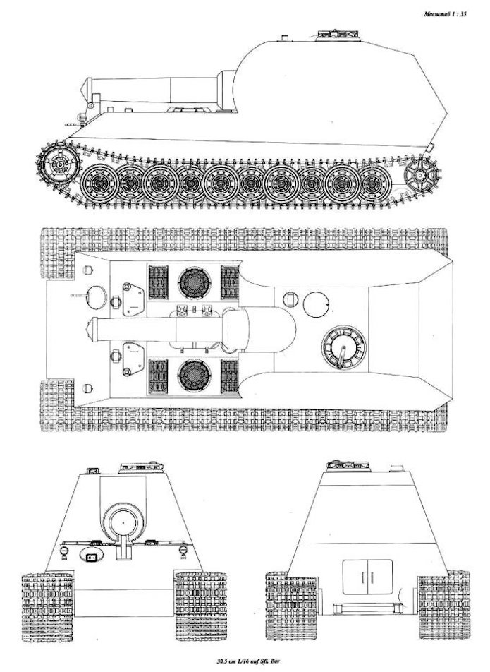 mètres, la pression massique est estimée à 1,02 kg/cm2 . Des valeurs qui auraient permis au 30,5cm L/16 auf Selbstfahrlafette Bär d’afficher un comportement honorable sur relief difficile, d’autant que sa garde au sol de 500 mm aurait repousse le moment où le plancher serait venu toucher les obstacles.