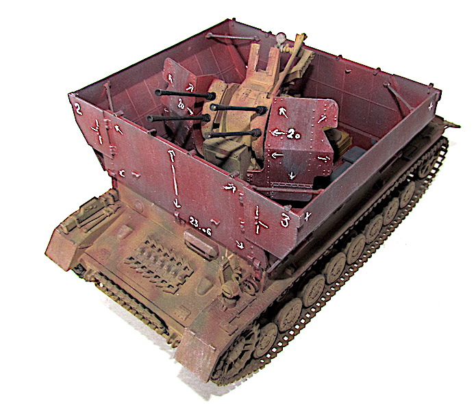 Le Flakpanzer 140 Leopard n’ayant pour vocation que de servir d’engin intermédiaire, et compte tenu des retards du programme Versuchsflakwagen Leichte für 2cm Flakvierling, 3,7cm Flak, oder 5cm Flak, la décision est prise en janvier 1943 de mettre au point un Flakpanzer reprenant des éléments mécaniques déjà existant , en l’occurrence la plate-forme du char moyen Panzer IV, mais équipé d’un train de roulement simplifié à six galets par côté, au lieu de huit de la version originelle, et des chenilles de 50 cm de large afin de mieux répartir le poids et de limiter la pression au sol. Par ailleurs, en février 1943, il est recommandé que des études soient menées avec les canons de 3,7cm Flak 36 ou 43, de 5cm Flak 41 ou encore le 2cm Flakvierling 38. La pièce doit par ailleurs être abritée des tirs d’armes légères et des éclats d’obus grâce à quatre volets rabattables, chacun étant constitué de deux plaques d’acier épaisses de 10 mm. En mai 1943 est rappelé le caractère urgent de la protection des chars face à la menace des appareils d’attaque au sol alliés. Par conséquent, le nouveau châssis n’étant pas prêt, la caisse standard d’un panzer IV est alors utilisée pour installer un 2cm Flkavierling 38 protégé par une superstructure mobile à double battant (2x12 mm) . Bien que les projectiles de 2cm manquent de puissance d’arrêt, leur capacité à saturer l’espace aérien paraît suffisante pour assurer la défense antiaérienne des panzer. En septembre 1943, le prototype est présenté dans l’enceinte du centre d’essai de Kummersdorf, près de Luckenwalde, à 25 km au sud de Berlin, au generaloberst Heinz Guderian. Les résultats sont suffisamment convaincants pour qu’en octobre, une commande de 20 exemplaires du 2cm Flakvierling auf Fahrgestell Panzerkampfwagen IV soit passée. Le calendrier prévoit une livraison dès le mois d’avril 1944. Toutefois, la décision est infirmée par la Panzekommission, sur avis d’Hitler, le 21 décembre 1943, et la 2cm quadruple est remplacé par un 3,7cm Flak 43 aux projectiles plus lourds. Il est vrai que sur le front de l’Est, la baignoire blindée qui protège le pilote d’un Iliouchine II-2 (Stumovik) est susceptible de stopper un projectile de 2cm, tandis qu’à l’Ouest, le Republic P-47 Thunderbolt s’avère extrêmement endurant du fait de son énorme moteur Pratt&Whitley R-2800-59 capable d’encaisser des obus de 2cm sans rendre l’âme.