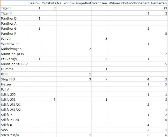 A titre d’exemple , en voici une liste non exhaustive : 7 TPp et chenillettes TK , Autoblinda AB41, Renault D2 et FT 17, automitrailleuses Wilton-Fijenoord, antiques Mark V capturés en Estonie et érigés en bunkers fixes, camions blindés de la police Daimler DZVR. On retrouve les classiques Panzer III, Stug III et Panzer IV à canon court sortis des écoles des Panzertruppen en dépit de leur vétusté. D’autres matériels plus « modernes » comme le Borward IV Wanze et le Flakpanzer IV kugelblitz sont déployés. Un T-35 est lui aussi sorti des réserves pour servir de point fixe dans le secteur de Kummersdorf. Des vétustés comme des Panzer I Ausf.A Holzgaz convertis en flammewerfer et des Panzer I Ausf.B mit 7,5cm Stuk 40 L/48 sont engagés avec des résultats plus ou moins probants. Des carcasses de chars Panther et de Panzer IV seront enterrés au milieu de la chaussée, sur les carrefours névralgiques berlinois pour servir de Panzer-Stellungen. Certains de ces chars donneront du fil à retordre aux blindés « rouges ».
