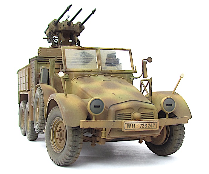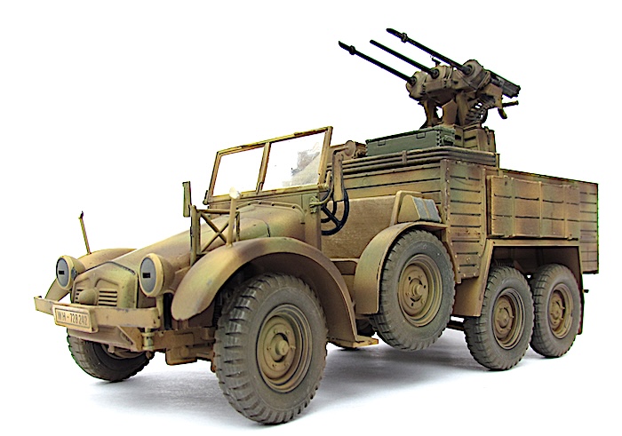 Produit à plus de 7 000 exemplaires, le Krupp Protze était un camion allemand à six roues 6x4. Le châssis polyvalent fut décliné en plusieurs versions. Les principale sont le transport de personnels ( Kfz 70) et le tracteur d’artillerie pour le Pak 36 de 3,7 cm (Kfz 69). Il fut également converti en véhicule pour les transmissions.