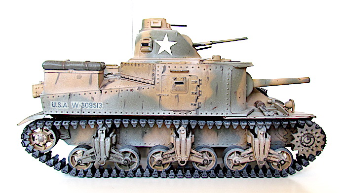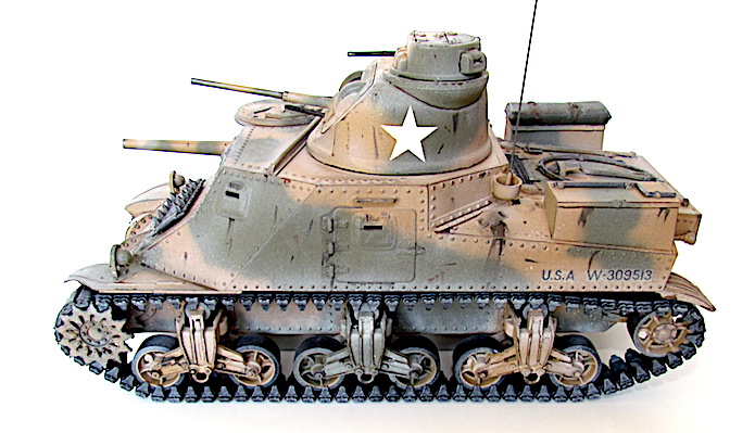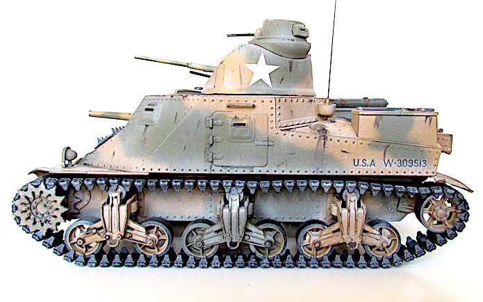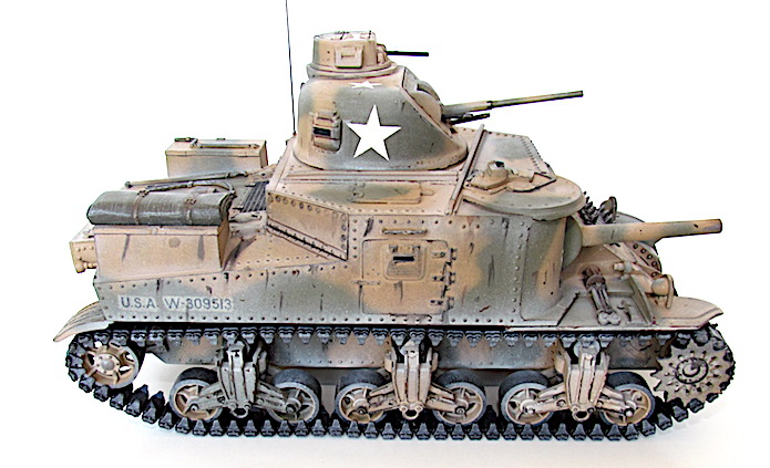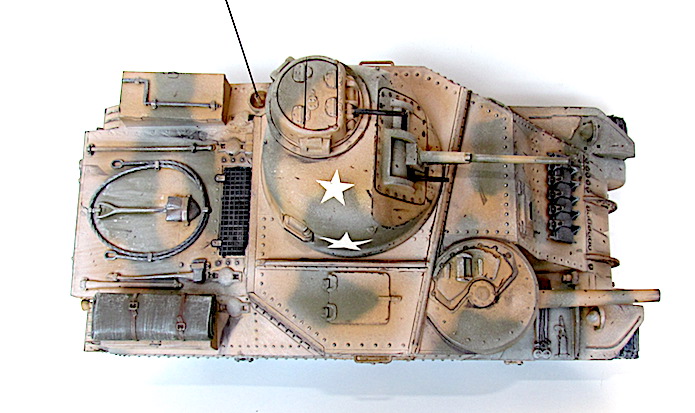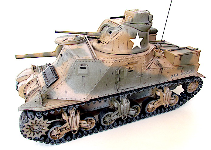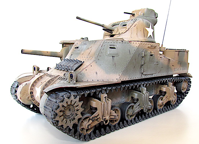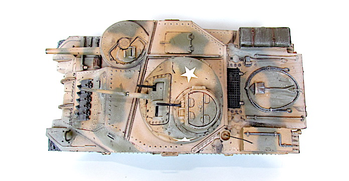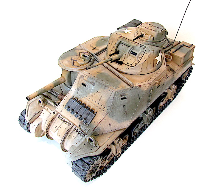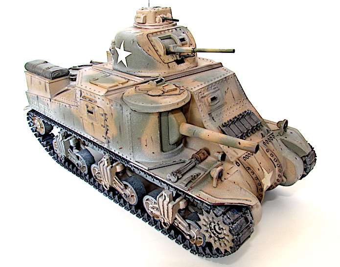 La réponse des Américains fut rapide; ils équipèrent tout simplement les modèles déjà existants du canon de 75 mm requis. La tourelle du nouvel engin (le char moyen M2 qui n’allait jamais entrer en action) ne pouvant pas recevoir de canon aussi important, il fallut donc le fixer sur la coque. Par conséquent, le modèle de char révisé conservait la tourelle du canon de 37 mm, l’arme principale étant placée sur un encorbellement à la droite de la coque. Le canon de 75mm était une version améliorée du fameux canon français de même calibre, mais de nouvelles munitions en faisait une arme puissante pour l’époque. L’armement secondaire comprenait quatre mitrailleuse de 7,62 mm (situées, l’une dans la coupole du chef de char au dessus de la tourelle, l’autre dans le même axe que le canon de 37mm, les deux autres sur la coque).
