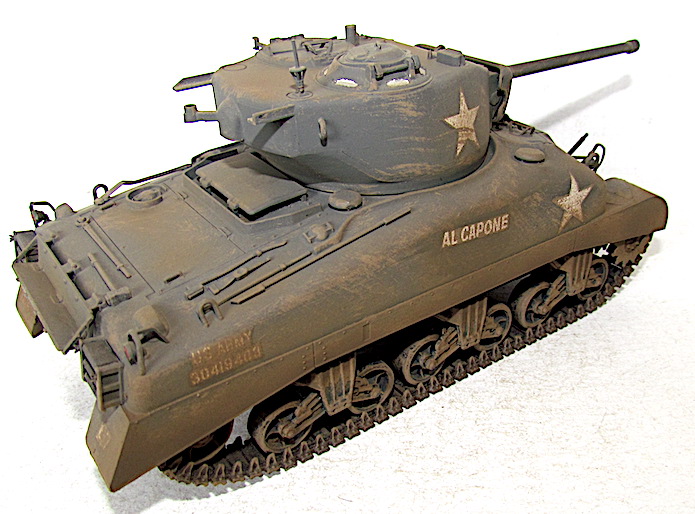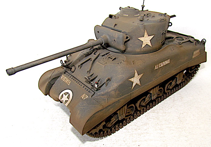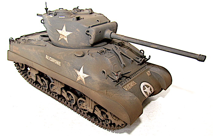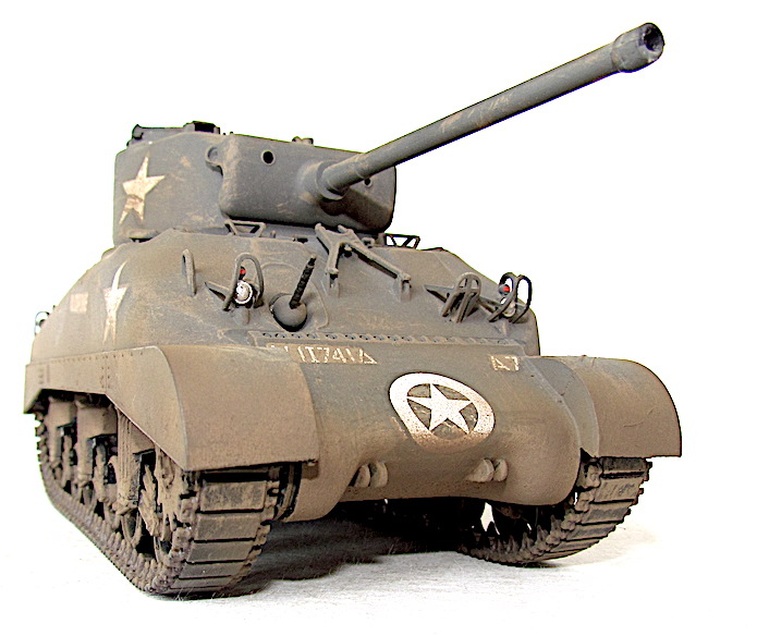 Afin de faire face aux Panther et autre Tiger, le M4A1 se voit greffer une tourelle T20/T23 accueillant un canon M1, ou l’un de ses dérivés, de 76 mm . Avec ce tube de 55 calibres, les performances balistiques progressent par rapport au 75 mm M3. Ainsi , avec une vitesse initiale de 792 m/s, son projectile AP M79 Shot (Armor Piercing) de 6,8 kg transperce 88 mm de blindage à 500 mètres sous une incidence de 30° et encore 56 mm à 1 500 mètres. Si le gain lui permet de venir à bout sans difficulté d’un Panzer IV aux distances usuelles de combat, il n’en va pas de même dans le cas du Panther doté d’un cuirasse plus épaisse et inclinée. Les Sherman de base se révélant sensibles aux incendies, notamment à cause du manque de protection de leurs munitions, cette version, désignée W pour Wet Stowage (casier humide) intègre des casiers à obus doublés d’un compartiment contenant un mélange d’eau et de glycérine. Le train de roulement VVSS ( Vertical Volute Spring Suspension) est dit de deuxième génération, avec un rouleau porteur décentré vers l’arrière .