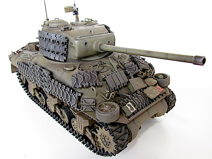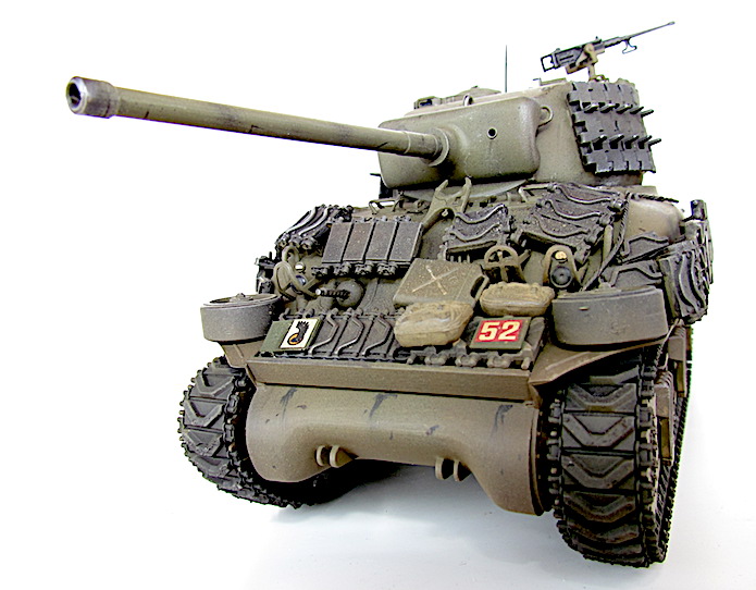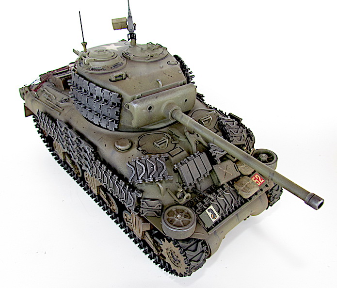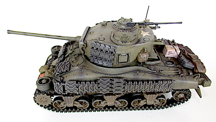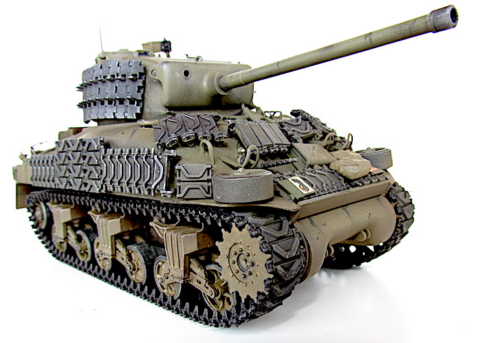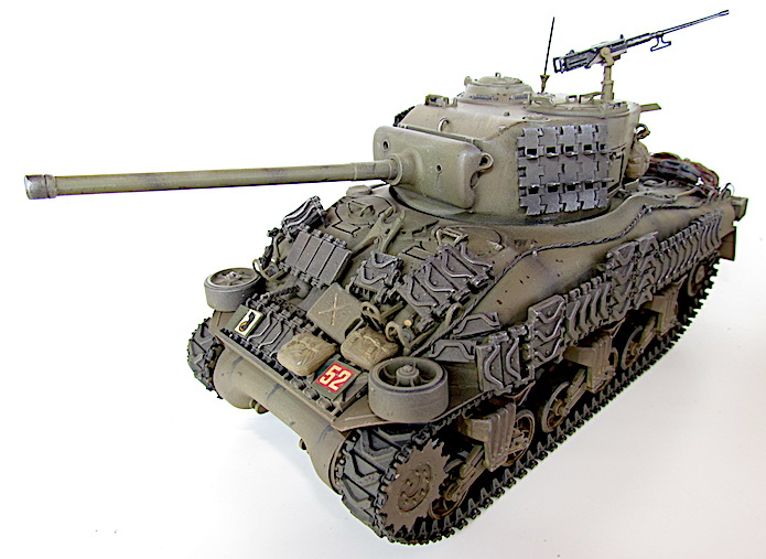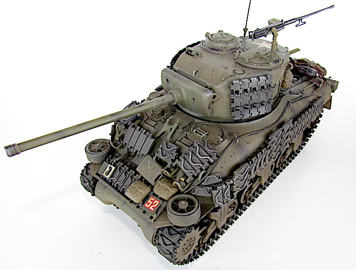 Afin de faire face aux Panther et autres Tiger, le M4A1 se voit greffer une tourelle T20/T23 accueillant un canon M1, de 76 mm. Avec un tube de 55 calibres, les performances balistiques progressent par rapport au 75 mm M3. Ainsi, avec une vitesse initiale de 792 m/s, son projectile AP M79 Shot (Armor Piercing) de 6,8 kg transperce 88 mm de blindage à 500 mètres sous une incidence de 30° et encore 56 mm à 1 500 mètres. Si le gain lui permet de venir à bout sans difficulté d’un Panzer IV aux distances usuelles de combat, il n’en va pas de même dans le cas du Panther doté d’une cuirasse plus épaisse et inclinée. Les Sherman de base se révélant sensibles aux incendies, notamment à cause du manque de protection de leurs munitions, cette version , désignée W pour Wet Stowage (casier humide) intègre des casiers doublés d’un compartiment contenant un mélange d’eau et de glycérine. Le train de roulement VVSS (Vertical Volute Spring Suspension) est dit de deuxième génération, avec un rouleau porteur décentré vers l’arrière.