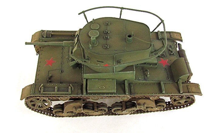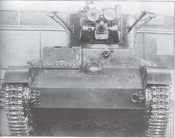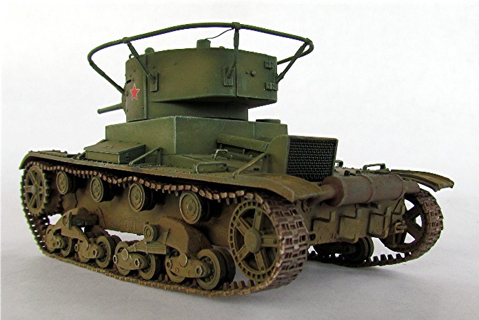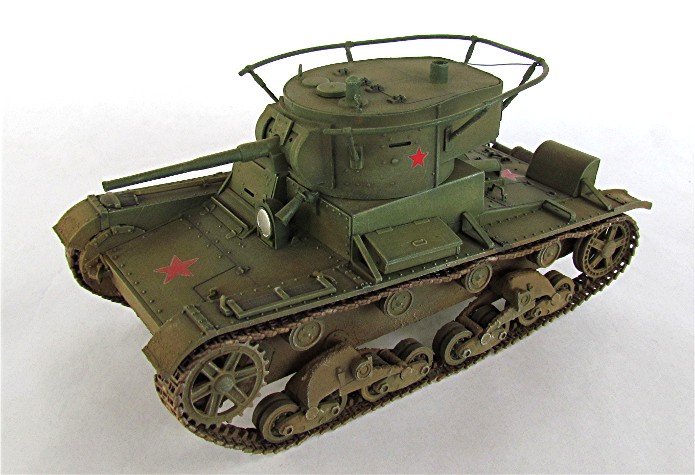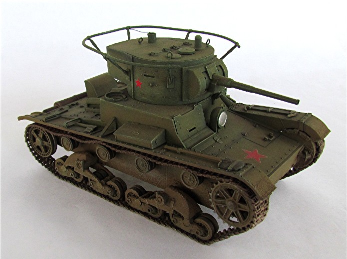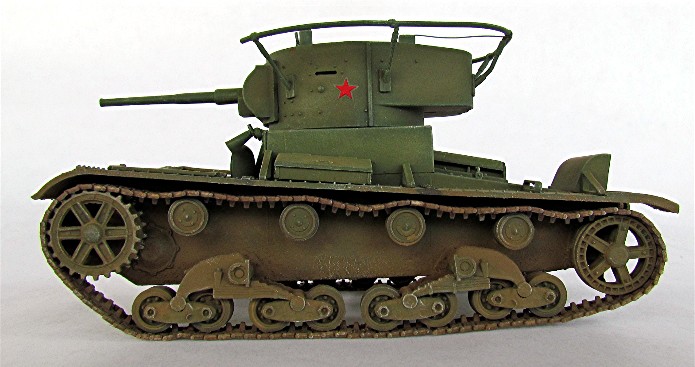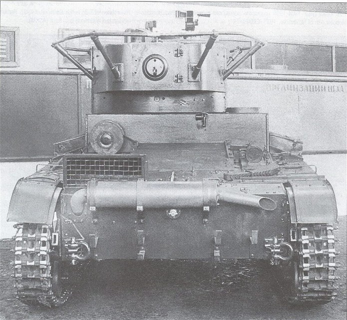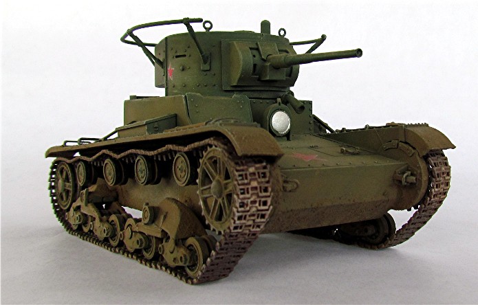 La greffe d’un canon de 37 mm démontre que les petites tourelles n’acceptent que difficilement des armes à la culasse volumineuse plus qu’une mitrailleuse. Le système double est alors supprimé au profit d’une simple tourelle, plus vaste, développée par la Zavod 232 Bolchevik de Leningrad, et KhPz dituée à Kharkov. Aussi désigné T-26 modèle 34 mono-tourelle à canon de 45, le blindé est armé d’un canon de 45 mm modèle 20K. Les premières machines sont dotées d’une tourelle ronde, avec une nuque rajoutée, et d’un masque de canon soudé. Les T-26 Ob 1933 ultérieurs sont équipés d’une tourelle avec un masque de canon embouti. La caisse abandonne progressivement les rivets pour des soudures. Ces dernières améliorent, en effet, la résistance structurelle. En cours de production, la capacité des réservoirs est augmentée pour accroître l’autonomie. La tourelle est armée d’une Degtariev de 7,62 mm placée dans la nuque. Un dispositif capable d’accueillir une mitrailleuse antiaérienne est parfois installé sur le toit. Certains engins sont équipés de deux phares au-dessus du canon, pour le combat de nuit.