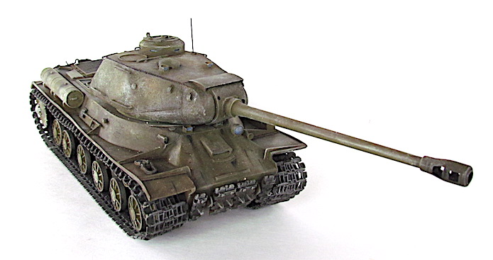 Immédiatement après le début de la production de l’iS-1, la nécessité de disposer d’un canon de plus grande puissance s’impose pour laisser l’utilisation du 85mm au T-34/85. Cependant, à l’usine de Cheliabinsk, quelques exemplaires sont fabriqués avec due canon qui par la suite seront réarmés. Le nouveau canon BS-3 de 100 mm est testé sur un nombre réduit d’unités mais sans que la production soit autorisée car le général Petrov envisage alors d’y monter le canon D-25T de 122 mm( à; projectile et charge séparés), beaucoup plus efficace et avec de meilleures possibilités de production. Le moteur , un S (V2K) diesel de 12 cylindres en V de 520 chevaux de puissance, est capable de donner au char une vitesse sur route de 37 km/h, ce qui était remarquable par rapport à son poids de plus de 40 tonnes. A la fin novembre 1943, diverses évaluations sont faites sur le terrain de Kubinka près de Moscou où le canon de 122 mm démontre sa puissance en transperçant le blindage frontal d’un Panther récupéré au combat. Le jgko est enthousiasmé et ordonne sa production en série sous le nom de IS-2.
