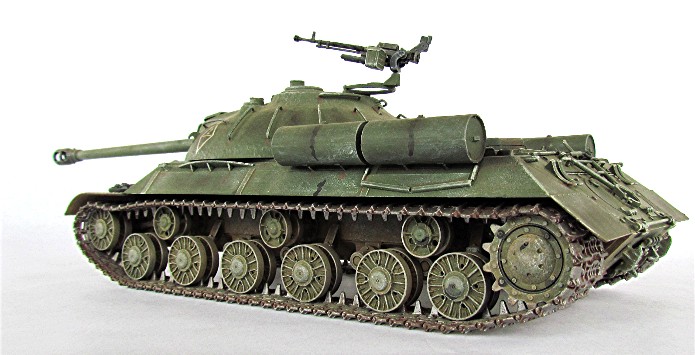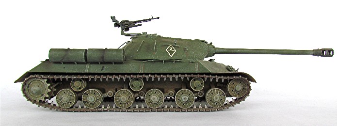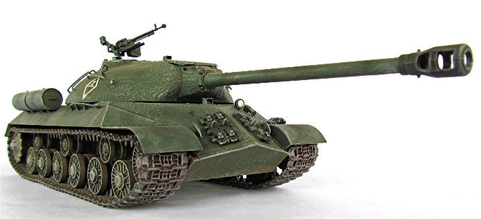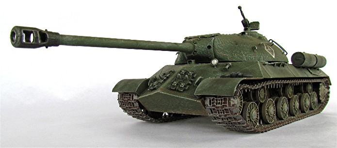 En août 1942, les services de renseignements russes découvrent que les ingénieurs allemands travaillent sur un projet de chars lourds d’une nouvelle génération dotée d’un armement plus puissant et d’un blindage plus épais. Pour contrer cette nouvelle menace, les ingénieurs russes se mettent eux aussi à l’étude d’un nouveau char lourd. Profitant de l’expérience acquise à la création des nouveaux modèles KV expérimentaux (KV-3 et KV-13), le bureau d’étude se penche, en 1943, sur un nouveau projet appelé IS (Iosef Stalin). Au début de l’automne 1943, les trois premiers prototypes du IS-1 sont terminés. Armé d’un canon de 85mm, le modèle est approuvé par la commission spéciale du commissariat supérieur de la défense. A peine validé et mis en production, le besoin de disposer d’un blindé plus puissant se fait sentir. Le canon de 85mm équipe déjà le T-34. Il semble donc inapproprié de doter un char lourd d’un canon qui arme un char moyen. Quelques prototypes sont équipés d’un canon de 100mm, mais la conversion ne donne pas satisfaction. De plus le canon D-10 de 100 mm n’est pas disponible en quantité suffisante. On étudie un nouveau projet sous la houlette du général Petrov. Ce projet prévoie l’installation d’un canon de 122 mm. Fin octobre 1943, le char, ainsi armé, achève ses essais en usine et sur le terrain où il donne satisfaction. Accepté comme arme standard, il est baptisé IS-2. Cependant, on continua les études sur une amélioration du blindage sur plusieurs chars expérimentaux. Koursk fut un excellent terrain pour tester les nouveaux chars et de nombreux enseignements en résultèrent. Il apparaît que les blindés soviétiques sont généralement détruits par des coups directs à l’avant de la tourelle ou du glacis de la caisse. La parade serait l’élaboration d’une tourelle radicalement différente des tourelles en service et d’une augmentation du blindage qui devait atteindre au moins 200 mm d’épaisseur pour résister aux obus allemands. Début 1944, un pas de plus dans l’escalade au blindage est franchi, les russes apprennent l’entrée en service du Tigre II. Le canon de 8,8 cm KwK L/71 est capable de détruire tous les chars soviétiques à longue distance. L’IS-2 est déjà surclassé. Les ingénieurs de Chelyabinsk doivent se pencher à nouveau sur les planches à dessin.