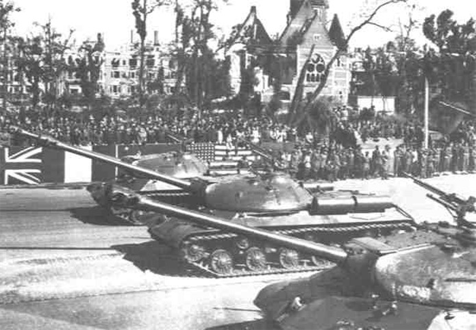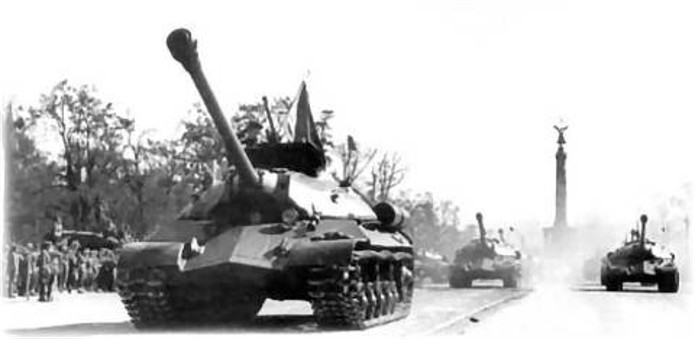 En octobre 1944, le prototype de l’IS-3 est finalisé en amalgamant les innovations résultant de deux projets. La production en série est autorisée en urgence en parallèle avec le JS-2 M. Malheureusement, la complexité du moulage de l’épais blindage retarde la fabrication en série. Les premiers chars quitteront les chaînes d’assemblage en mai 1945. Conçu par un groupe dirigé par N. Dukhov, ce char s’inspirait de la philosophie qui en matière de blindage avait donné naissance au T-34. Le blindage, encore plus épais et mieux dessiné d’un point de vue balistique, était fortement incliné afin d’offrir une protection optimale. L’IS-3 se distinguait des chars des générations précédentes par une coque en acier laminée et une tourelle en forme de carapace. Malgré toutes ses améliorations, le poids du char n’excédait pas celui du char allemand contemporain. Sa participation aux combats en Allemagne en 1945 est plus que douteuse, l’accès aux archives soviétiques montre que non. Son apparition au défilé de la victoire du 7 septembre 1945 fut un choc pour les Alliées et un énorme coup de bluff de la part des Soviétiques. Ce jour là, 52 chars Staline IS-3 défient devant un parterre d’officiels américains, britanniques et français. Ces chars appartiennent au 71e régiment de chars lourds de la Garde. Cette unité est normalement dotée de 21 chars lourds. Pour impressionner les ex-alliés, les russes n’hésitèrent pas à « gonfler » la dotation du régiment. Le char est photographié sous toutes ses coutures. Son blindage incliné et sa tourelle en forme de goutte d’eau aura une forte influence sur la conception des blindés d’après-guerre. L’IS-3 commencera sa carrière opérationnelle, en août 1945, lors de la courte campagne de Manchourie.