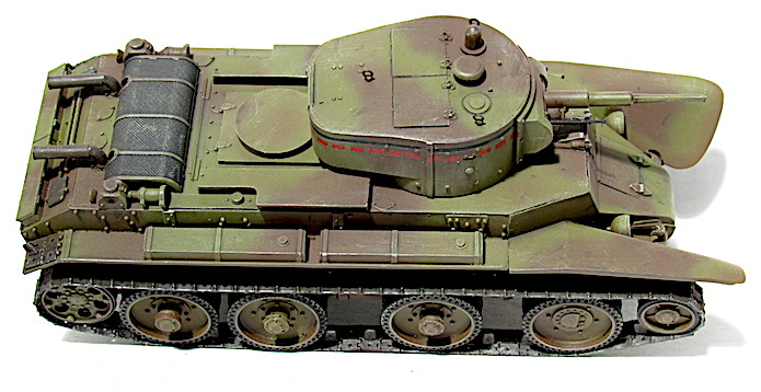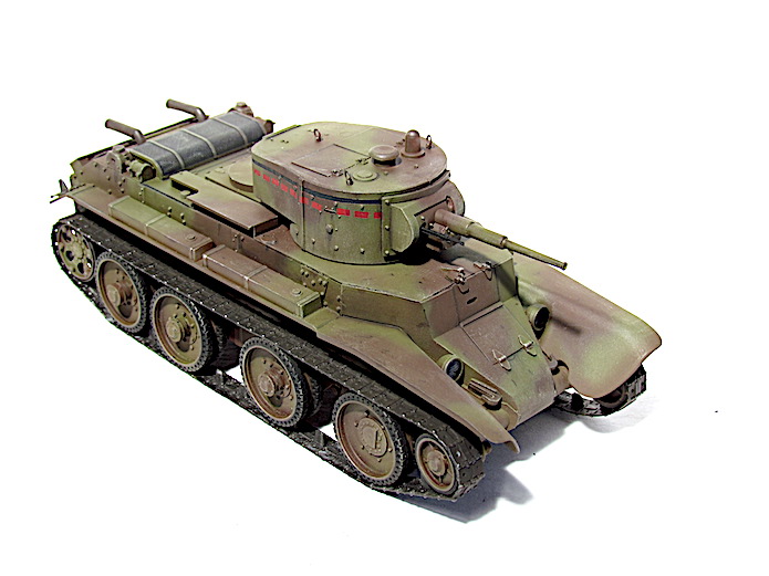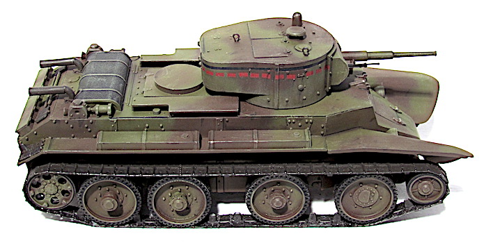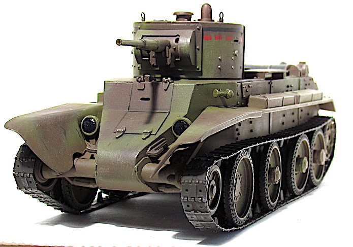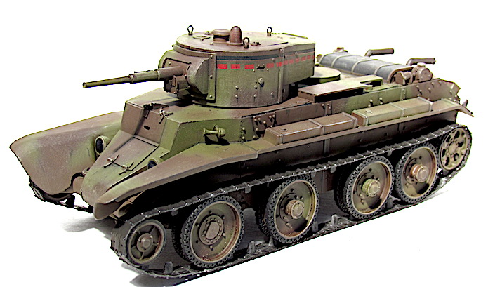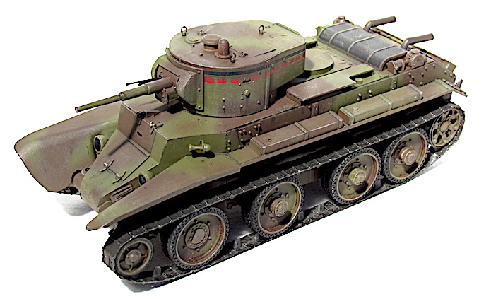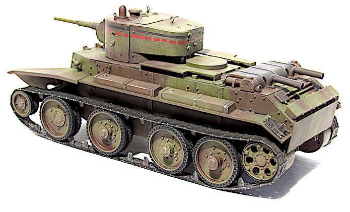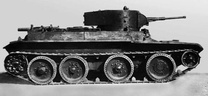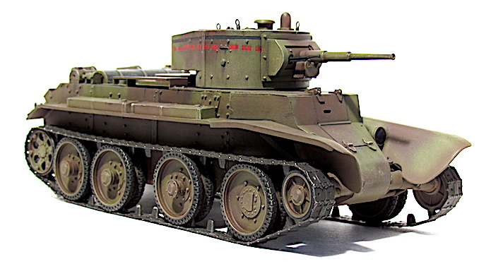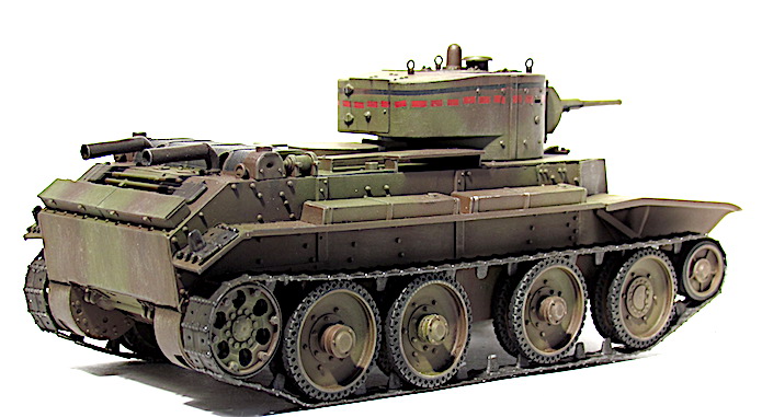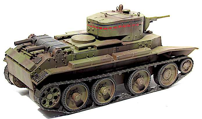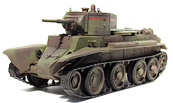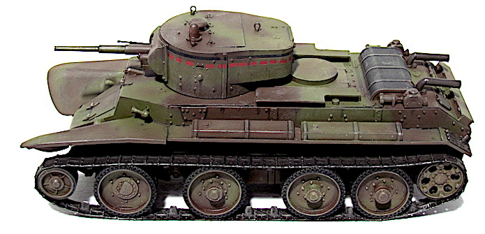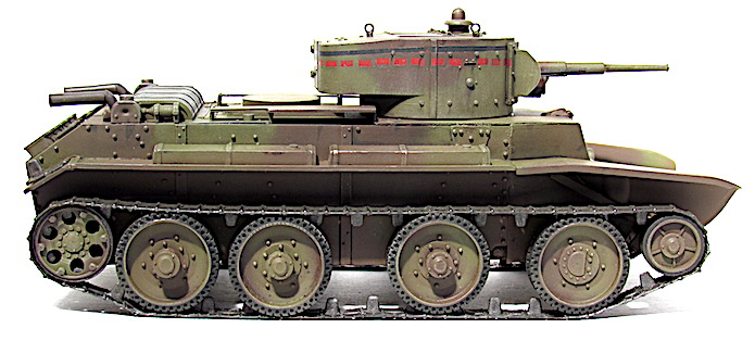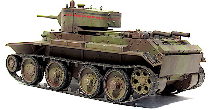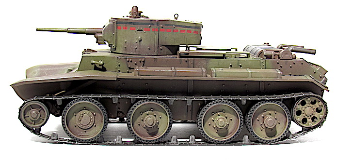 Les premiers BT soviétiques étaient copiés littéralement sur un prototype Christie livré à l’Union soviétique en 1930 et rebaptisé BT-1. Le premier modèle soviétique était le BT-2 et à partir de 1931, les séries de BT ne cessèrent d’évoluer et de s’améliorer pour aboutir, en 1935, à la production du BT-7.Version améliorée du BT-5, le BT-7 s’en distingue par son moteur M-17 qui est une adaptation d’un moteur d’avion et qui développe 450 chevaux .C’est un blindé léger, rapide et agile destiné aux unités de cavalerie de l’Armée rouge. La transmission et les suspensions ont été renforcées, afin de supporter l’augmentation de poids résultant d’une augmentation d’épaisseur du blindage. La suspension utilise des barres de torsion Christie qui permettent un degré élevé de flexibilité à grande vitesse. Le dessin de la coque en acier corroyé est fonctionnel. Elle est divisée en trois sections : poste pilotage, poste de combat et compartiment moteur. La caisse est désormais assemblée par soudure électrique. Une méthode qui renforce la structure du char tout en supprimant les risques de projection de rivets ou de boulons dans le compartiment de combat, en cas de coup au but.